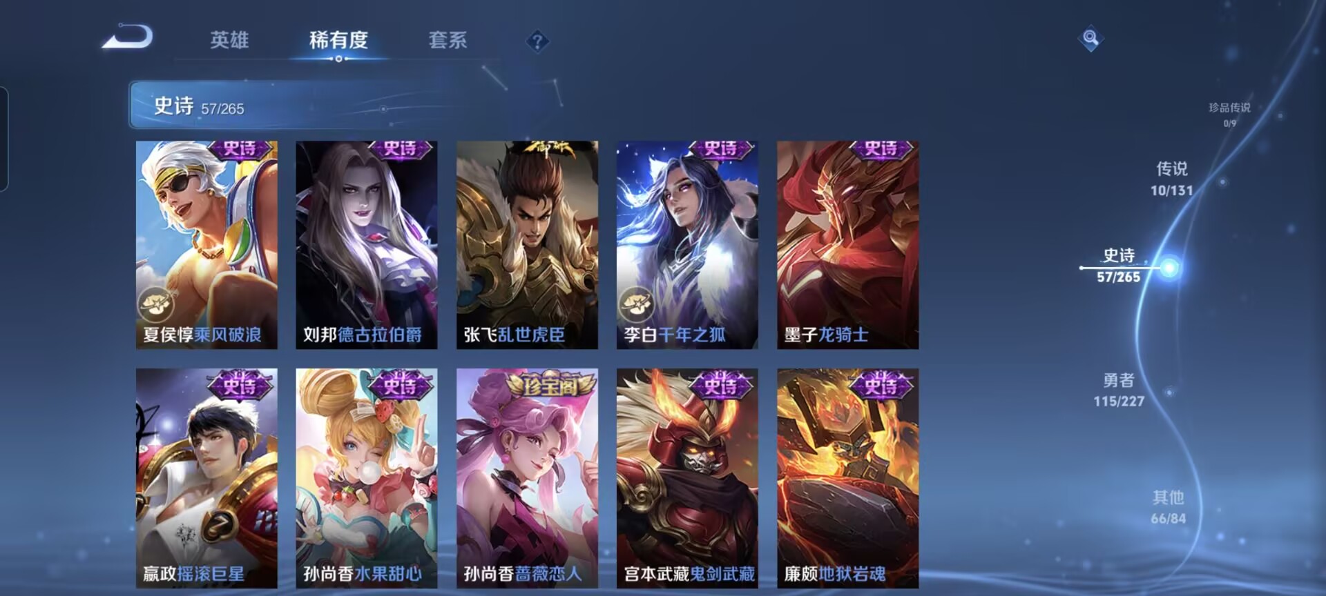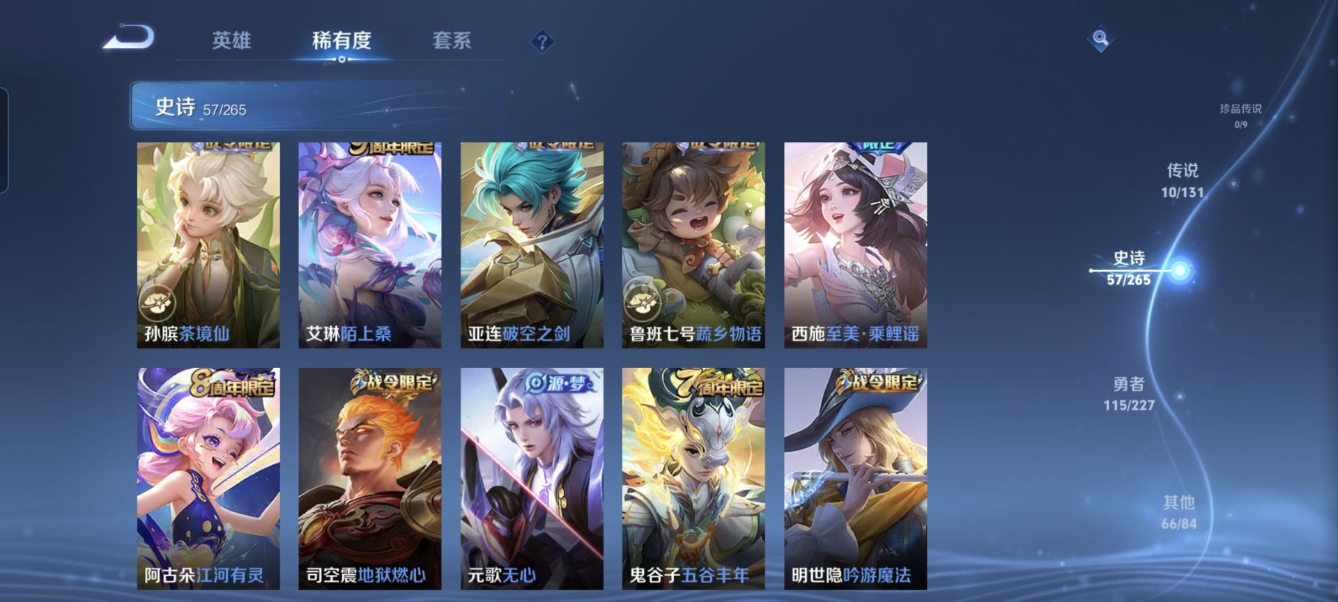 【史诗皮肤】 蔬乡物语 蔬乡物语 破空之剑 茶境仙 傲雪梅枪 布丁狗之约 谧流熔炉 鸭鸭历险记 龙之律动 地狱燃心 陌上桑 至美·乘鲤谣 百相守梦 踏浪烽翎 王牌新星 聚星闪耀 江河有灵 幻夜行动 决胜大