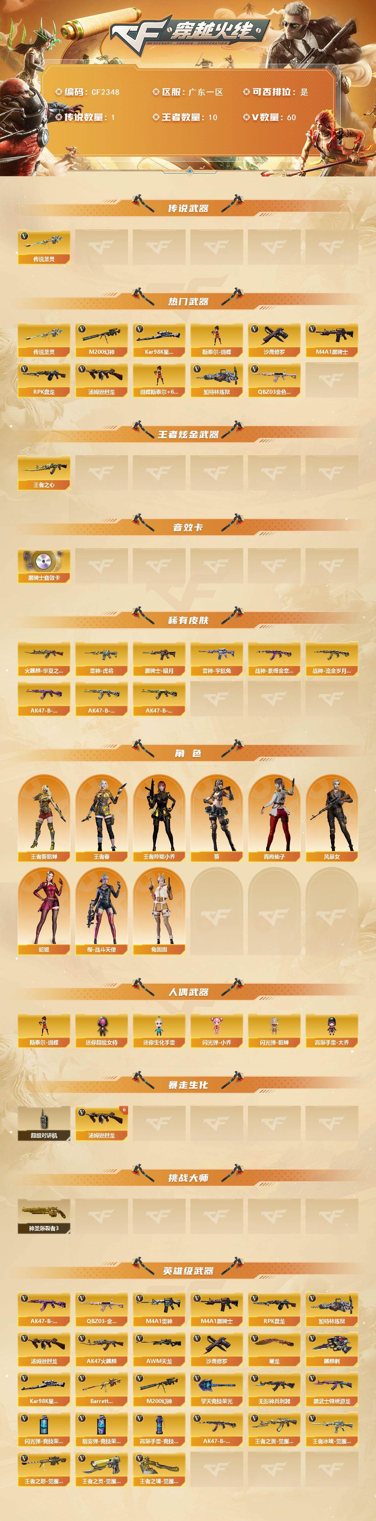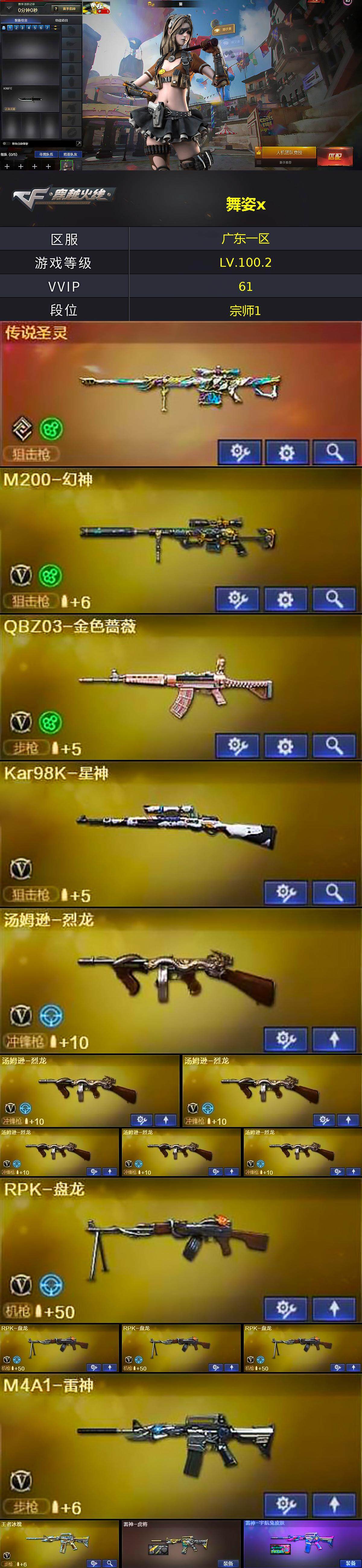 广东一区-60V-10王者-0炫金【双全号 传说圣灵,QBZ03-金色蔷薇,M200-幻神,Kar98K-星神,M4A1-黑骑士,汤姆逊-烈龙*6,RPK-盘龙*4,加特林-炼狱,斯泰尔-蝴蝶,沙鹰-修罗*5】