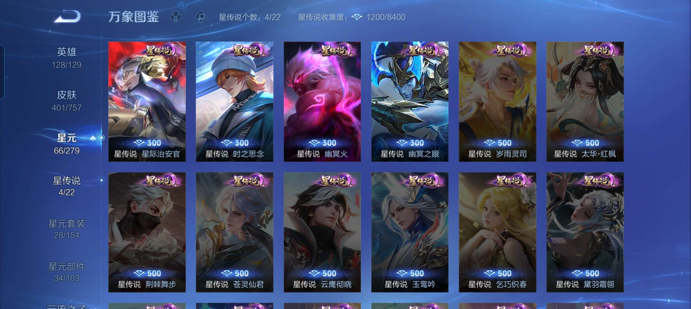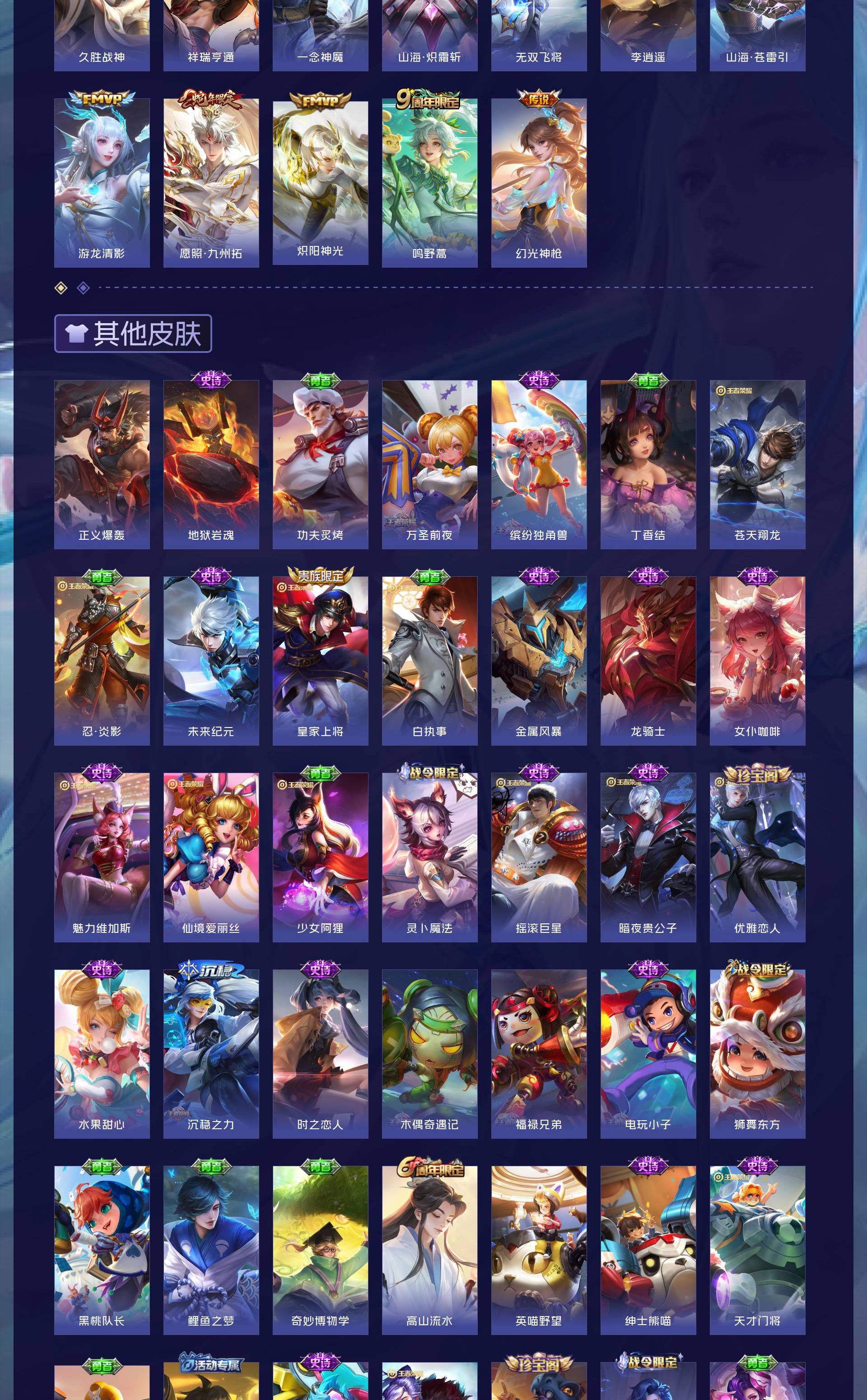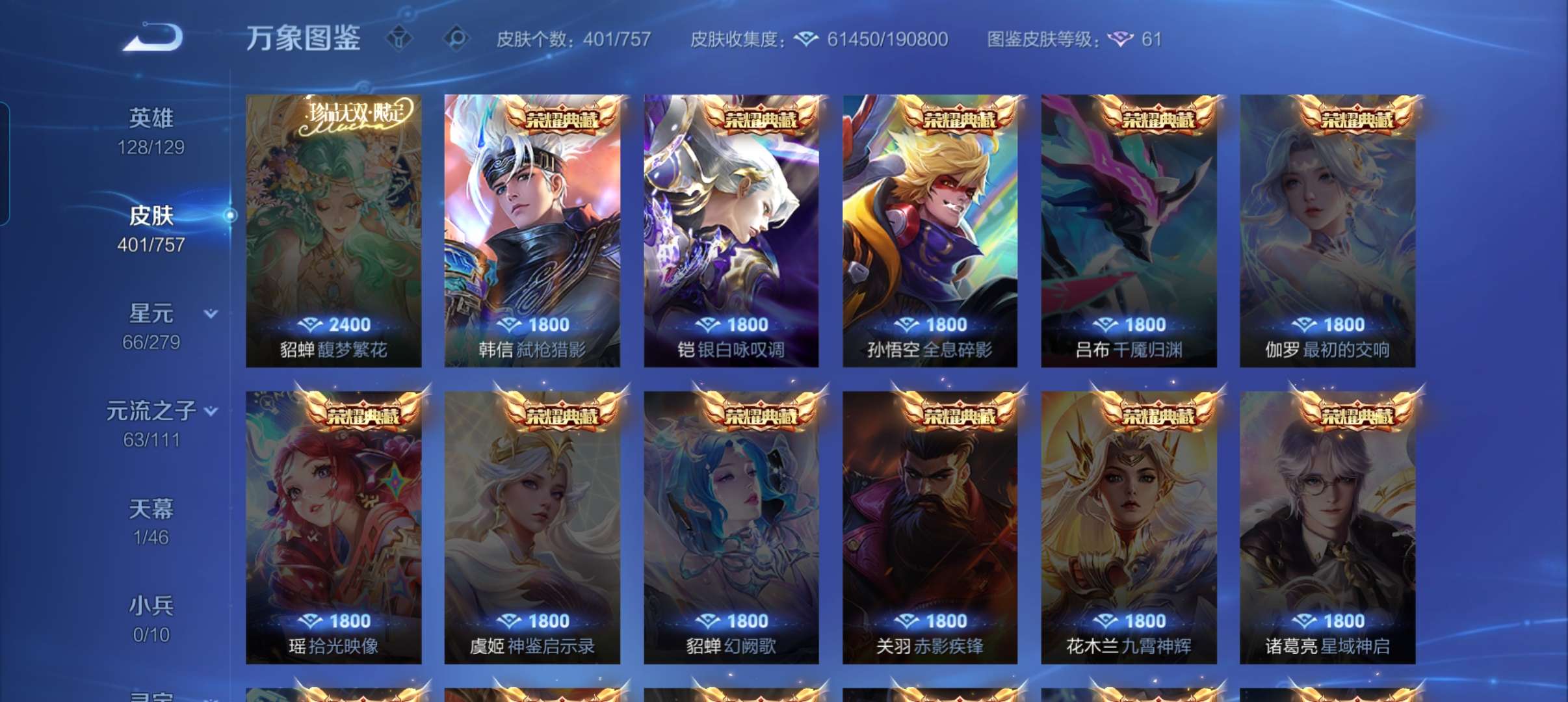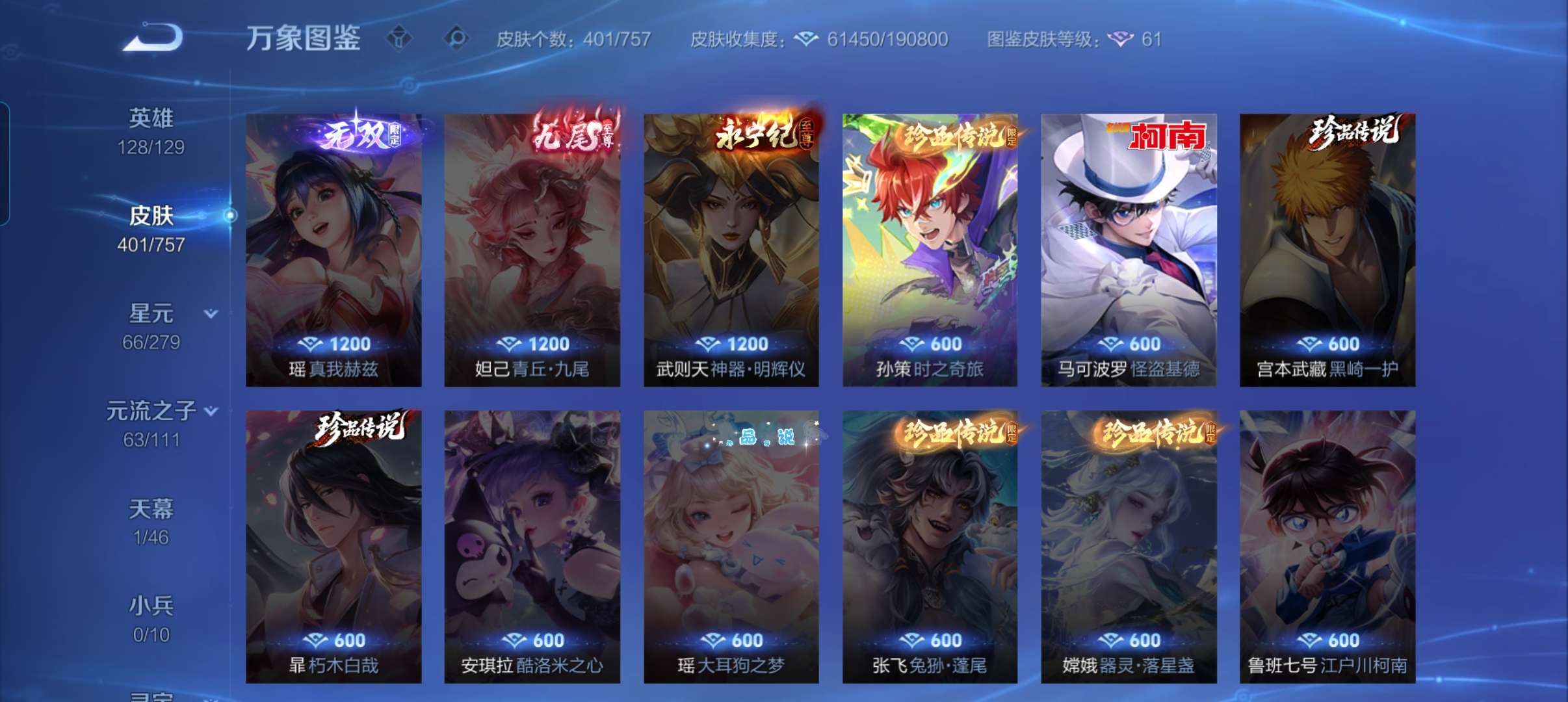 V9 皮肤401 英雄129 至尊星耀 荣耀典藏3 珍品传说2 星传说4 传说26 其他皮肤374
