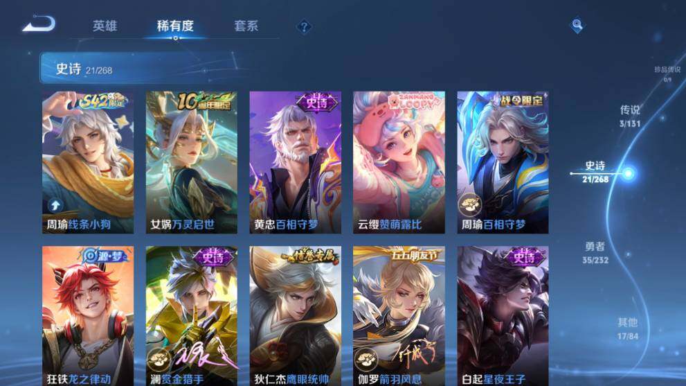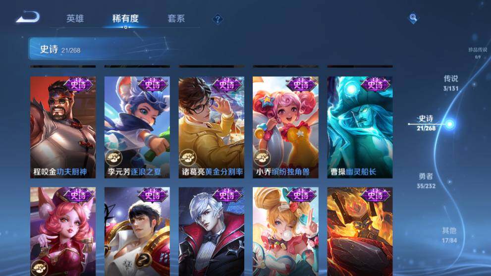 【史诗】赵云皇家上将,廉颇地狱岩魂,孙尚香水果甜心,嬴政暗夜贵公子,嬴政摇滚巨星,妲己魅力维加斯,曹操幽灵船长,小乔缤纷独角兽,诸葛亮黄金分割率,