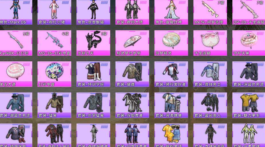 【粉色枪皮等级】:Kar98K-巳巳如意(五级),DP-28-千金淑猫(七级),MG-36-幻彩电音(四级)