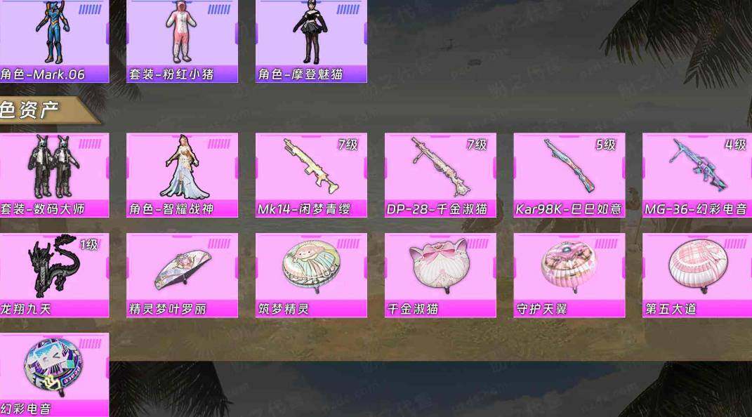 【粉色枪皮】:Kar98K-巳巳如意,Mk14-闲梦青缨,DP-28-千金淑猫,MG
