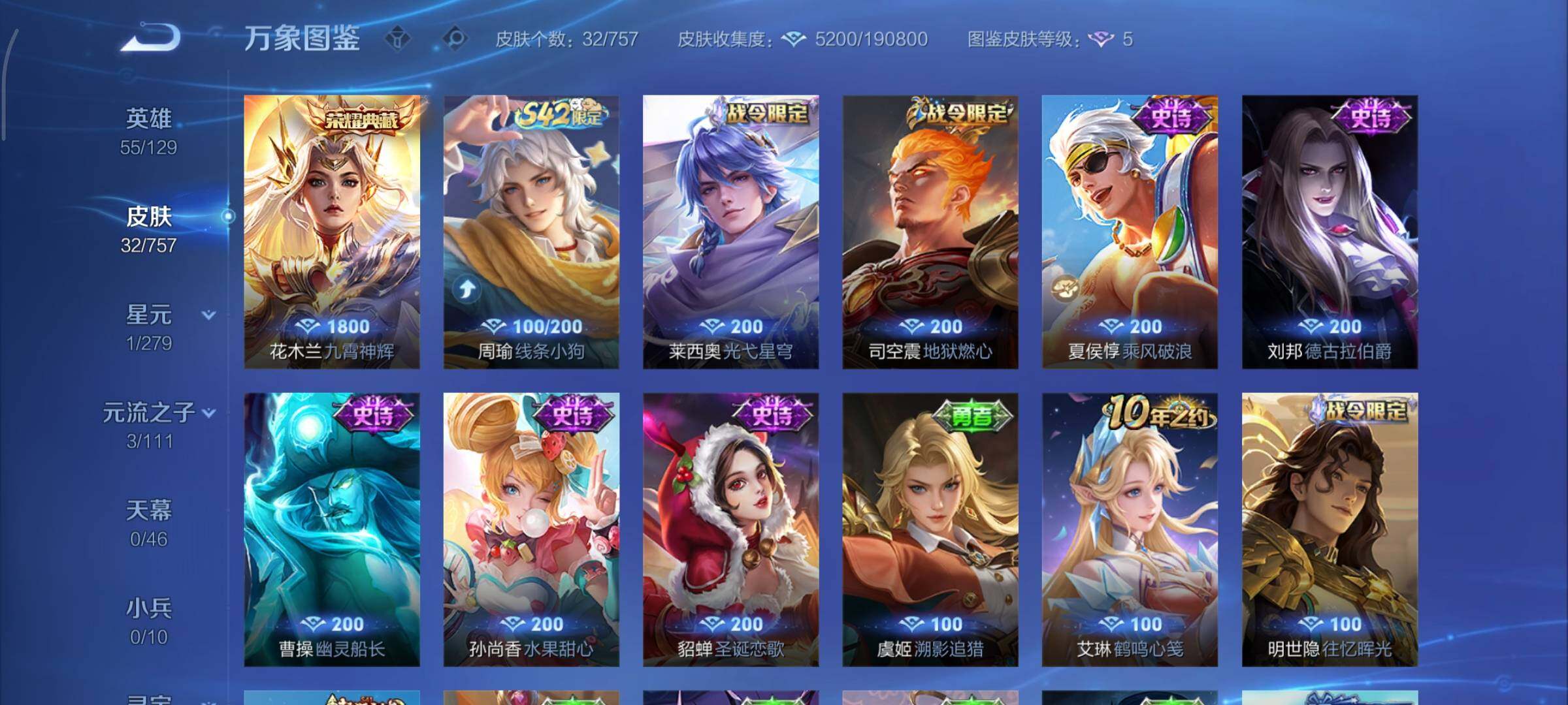 /可换绑 1王者印记 五级铭文20 可二次CD16054 安卓Q-V3-32皮肤-1典藏皮肤-7史诗【荣耀典藏】:花木兰九霄神辉【限定皮肤】:达摩星际陆战队,司空震地狱燃心【战令限定】:达摩星际陆战队,司空震地狱燃心【史诗皮肤】:貂蝉圣诞恋歌,孙尚香水果甜心,曹操幽灵船长,刘邦德古拉伯爵,夏侯惇乘风破浪,司空震地狱燃心,莱西奥光弋星穹,周瑜线条小狗【其他皮肤】:姜子