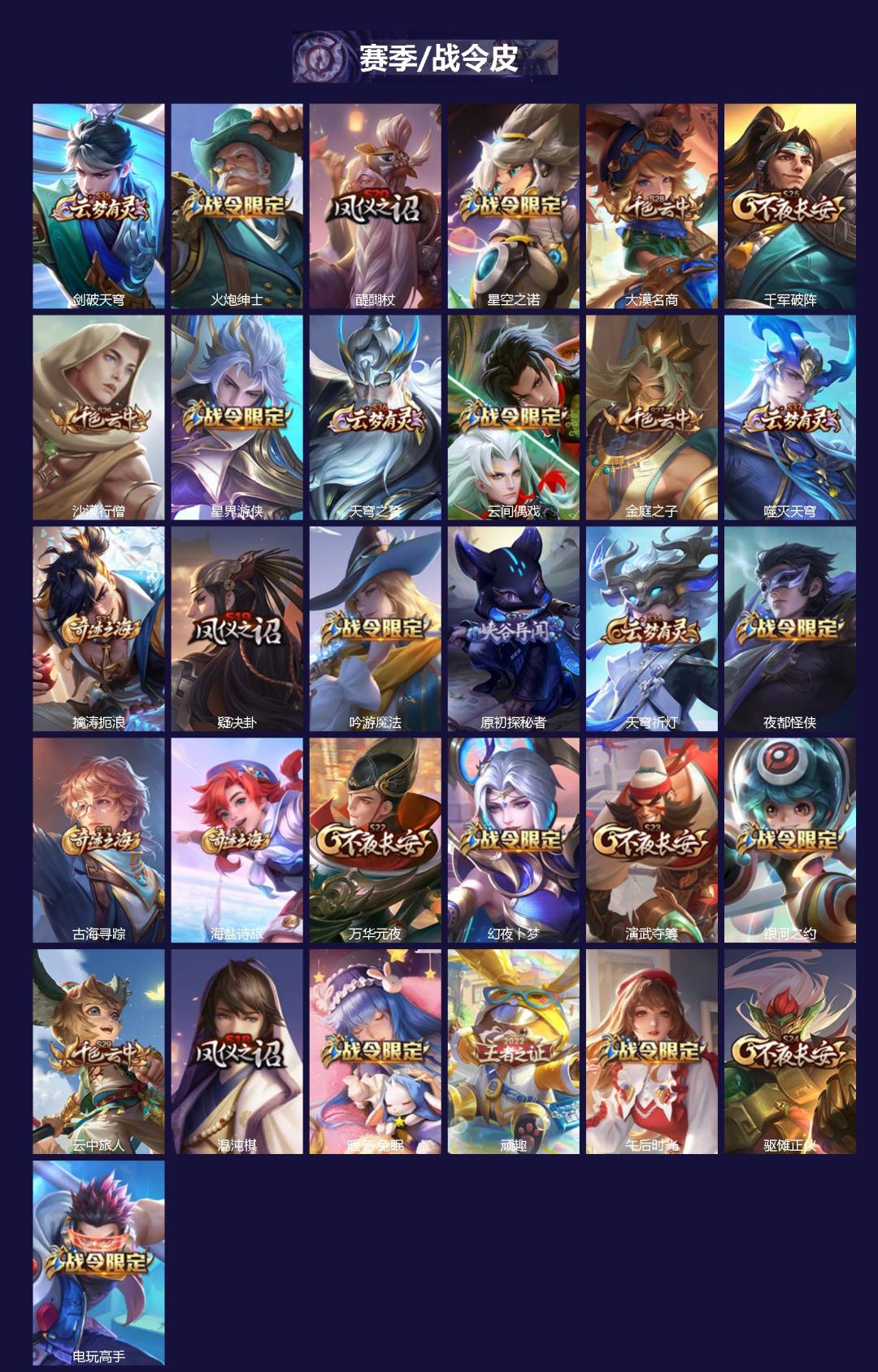 【传说皮】:山海·炽霜斩(李信年限),黄金射手座,零号·赤焰,仲夏夜之梦(大飞蛾),地狱之眼,一念神魔,淬星耀世,冠军飞将,久胜战神,云鹰飞将(小将军),炽阳神光,无双飞