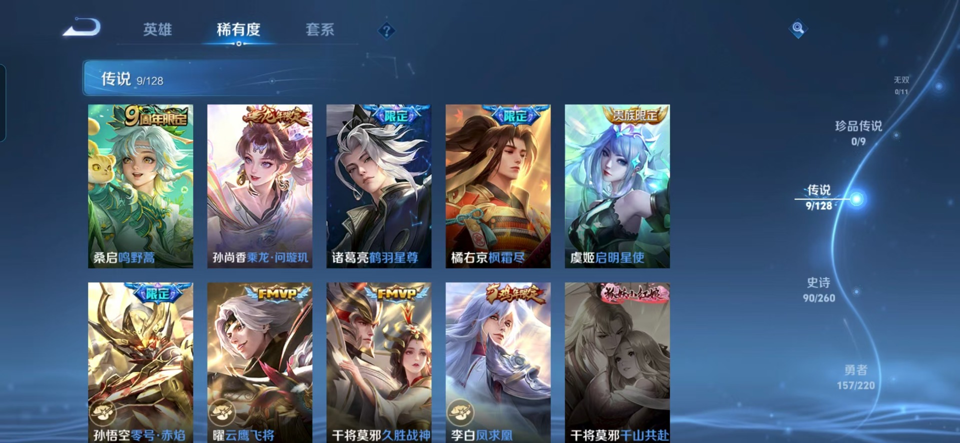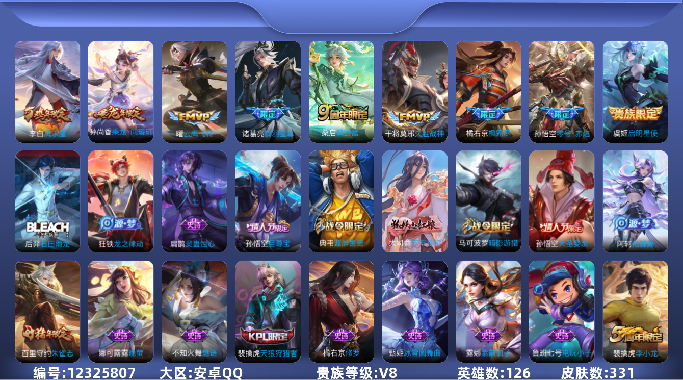 V8 9传说 126英雄 331皮肤 典藏英雄武则天 可修改实名 优质装备:云鹰飞将(小将军),久胜战神,零号·赤焰,鹤羽星尊 传说皮:乘龙·问璇玑(孙尚香年限) 珍宝阁皮:胡桃夹子,女武神,玩趣恶龙 限定皮:逐霄战戟,鸣野蒿,至尊宝,凤求凰(白切鸡),遇见飞天,高山流水,五谷丰年,游园惊梦,梁祝,天狼狩猎者,李小龙,朱雀志(守约年限),霸王别姬-虞姬,大圣娶亲,枫霜尽 史诗皮:化蝶舞,灵蛊蚀心,星界战将,龙之律动,石田雨龙,东方月初,琥珀纪元伽罗,紫霞仙子,电玩小子(小书包),白龙吟,黄金分割