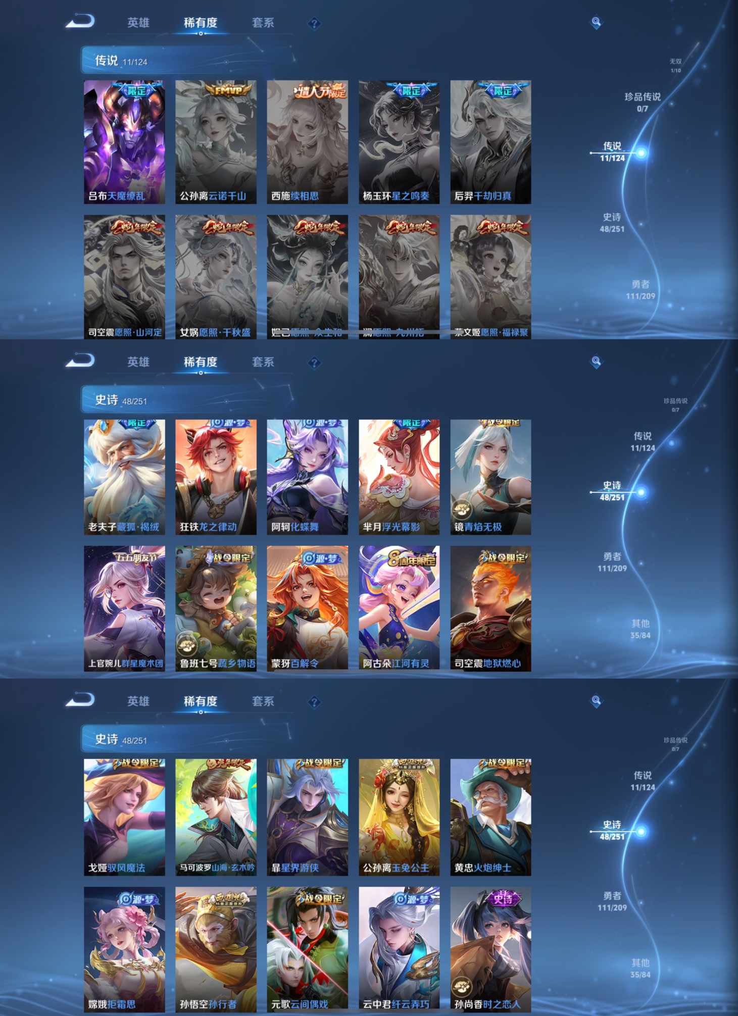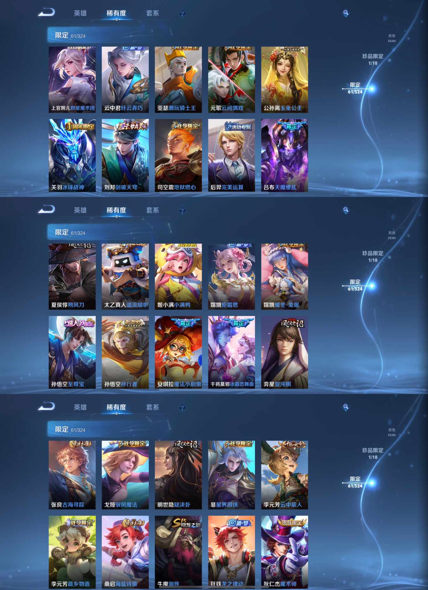 【史诗皮肤】 蔬乡物语 蔬乡物语 冰霜恋舞曲 冰锋战神 布丁狗之约 谧流熔炉 电玩小子 群星魔术团 至尊宝 孙行者 龙之律动 地狱燃心 山海·玄木吟 青焰无极 浮光幕影 苍威无极 王牌新星 聚星闪耀 江河有灵 百解令 藏狐·褐绒 化蝶舞 玉兔公主 星界游