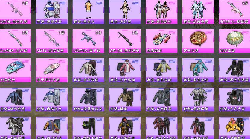 【粉色枪皮等级】:SCAR-L-锦绣绵绵(五级),M416-电玩时刻(五级),UMP45-量子极限(五级),Kar98K-巳巳如意(五级),Mk14-甜梦熊击(五级),DP-28-豹影疾电(五级)