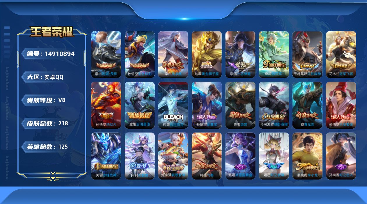 [14910894]V8 2典藏 9传说 125英雄 218皮肤 可修改实名
