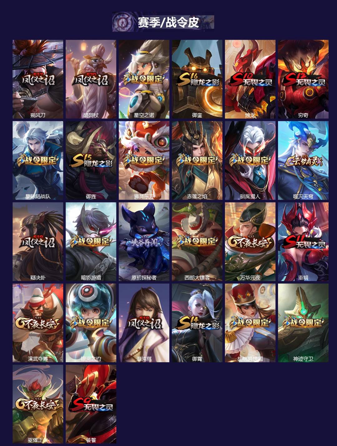 【赛季/战令皮】:噬灭天穹(s37),饕餮(s9),烛龙(s10),重明(s11),穷奇(s12),御霄(s14),御旌(s15),御銮(s16