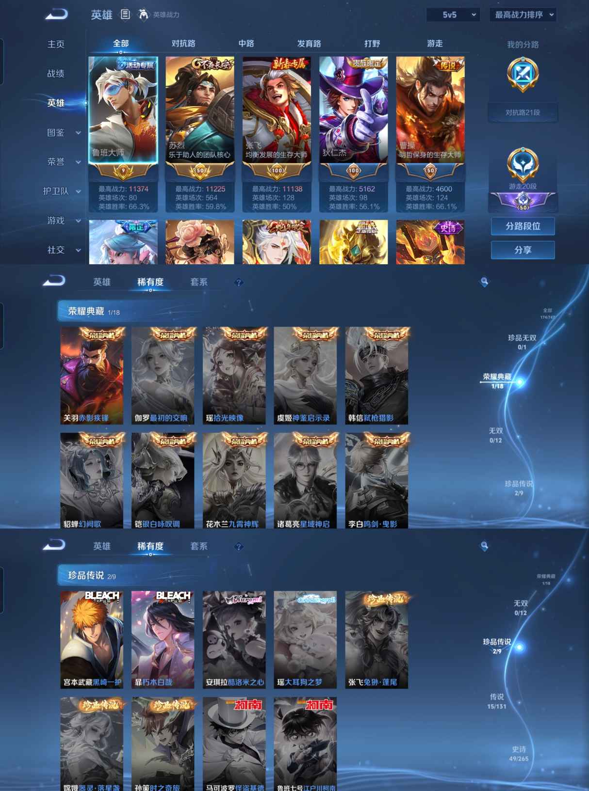 MWZ104166【v7 典藏1 珍品传说2 传说15 星传说1 幽冥之眼 万战金标鲁班大师11374战力 苏烈11225战力 张飞11138战力】安卓Q-174皮肤-124英雄 【珍品传说】 黑崎一护 朽木白哉