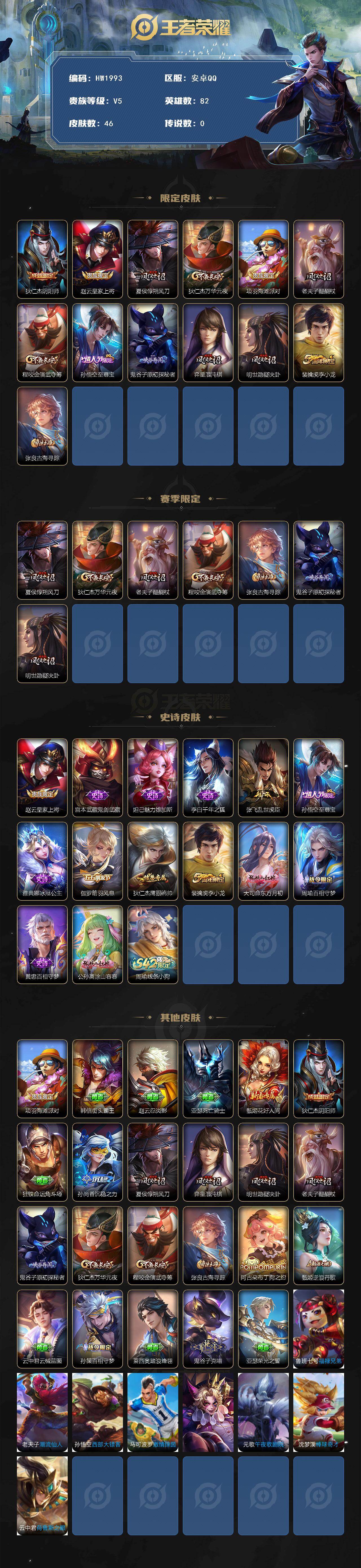 【限定皮肤】:狄仁杰阴阳师,赵云皇家上将,夏侯惇朔风刀,狄仁杰万华元夜,项羽海滩派对,老夫子醍醐杖,程咬金演武夺筹,孙悟空至尊宝,鬼谷子原初探秘者,弈星混沌棋,明世隐疑决卦,裴擒虎李小龙,张良古海寻踪