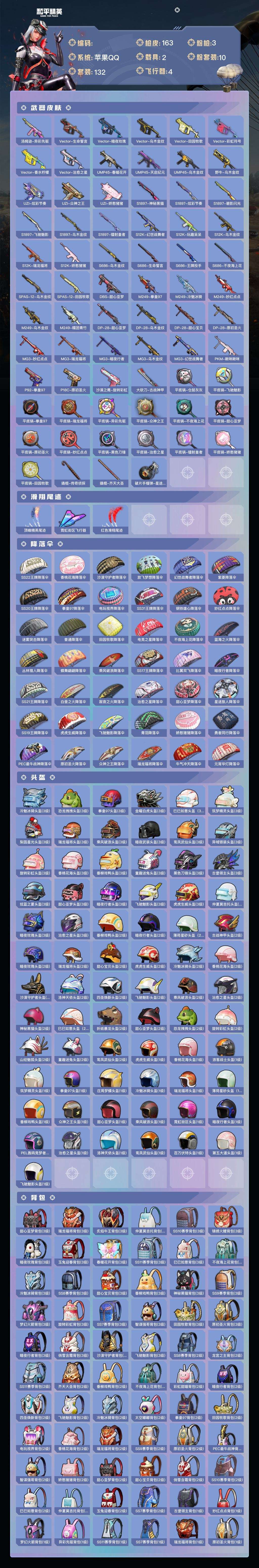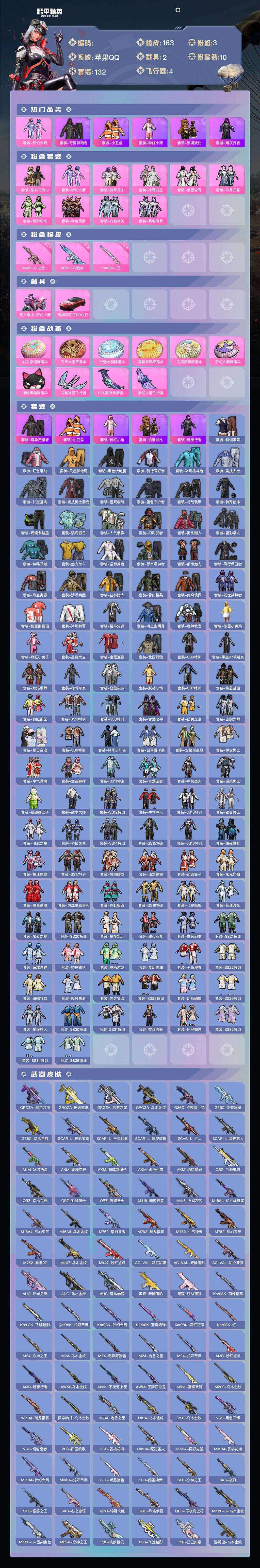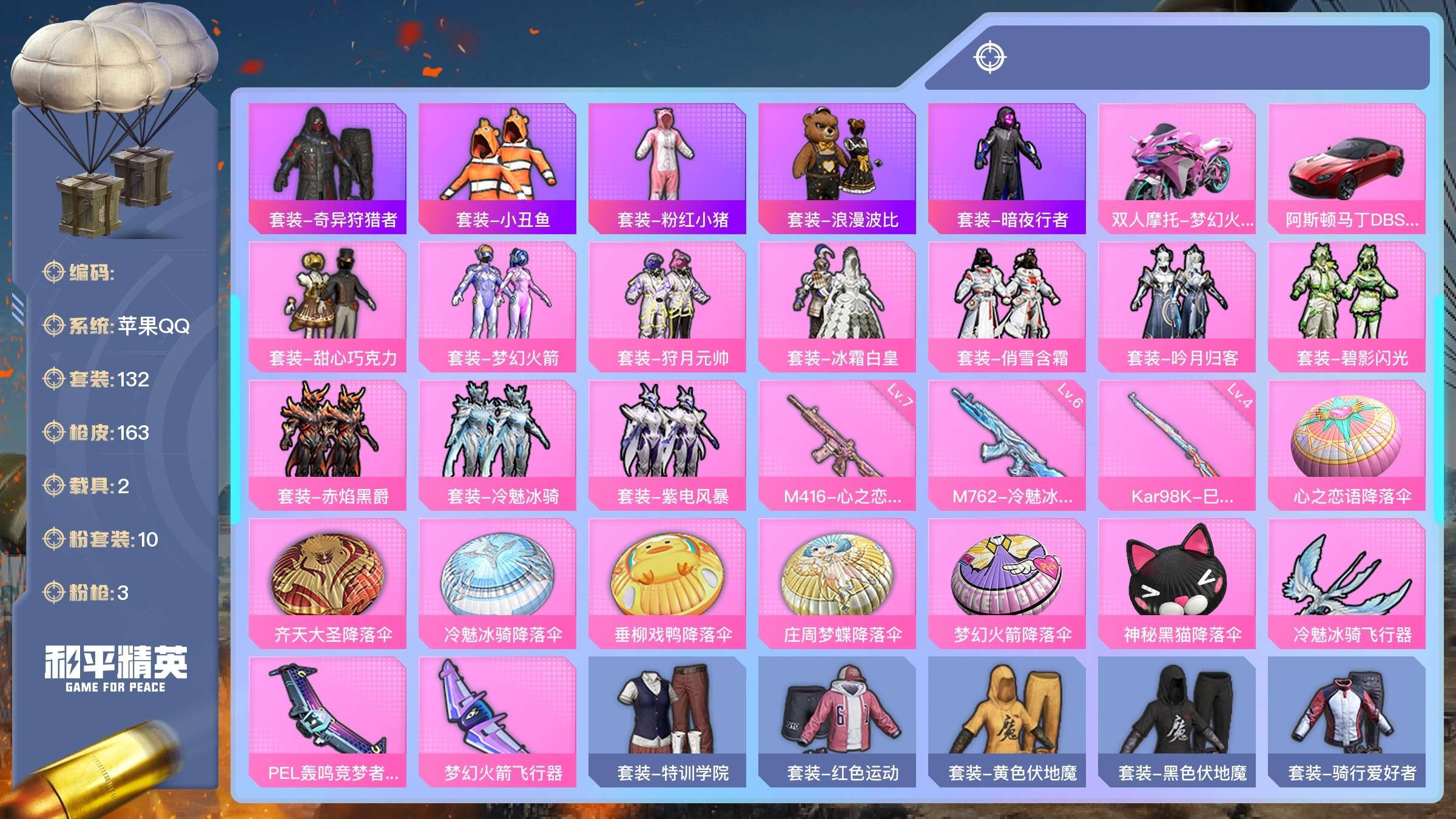 a4224/苹果QQ/热力值:57034,10粉装,3粉枪,2载具,10粉色战备,132套装,163