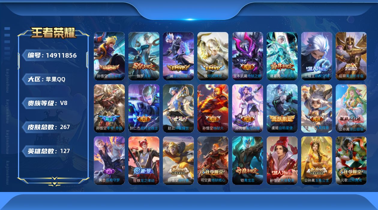 [14911856]V8 1典藏 14传说 127英雄 267皮肤 可修改实名