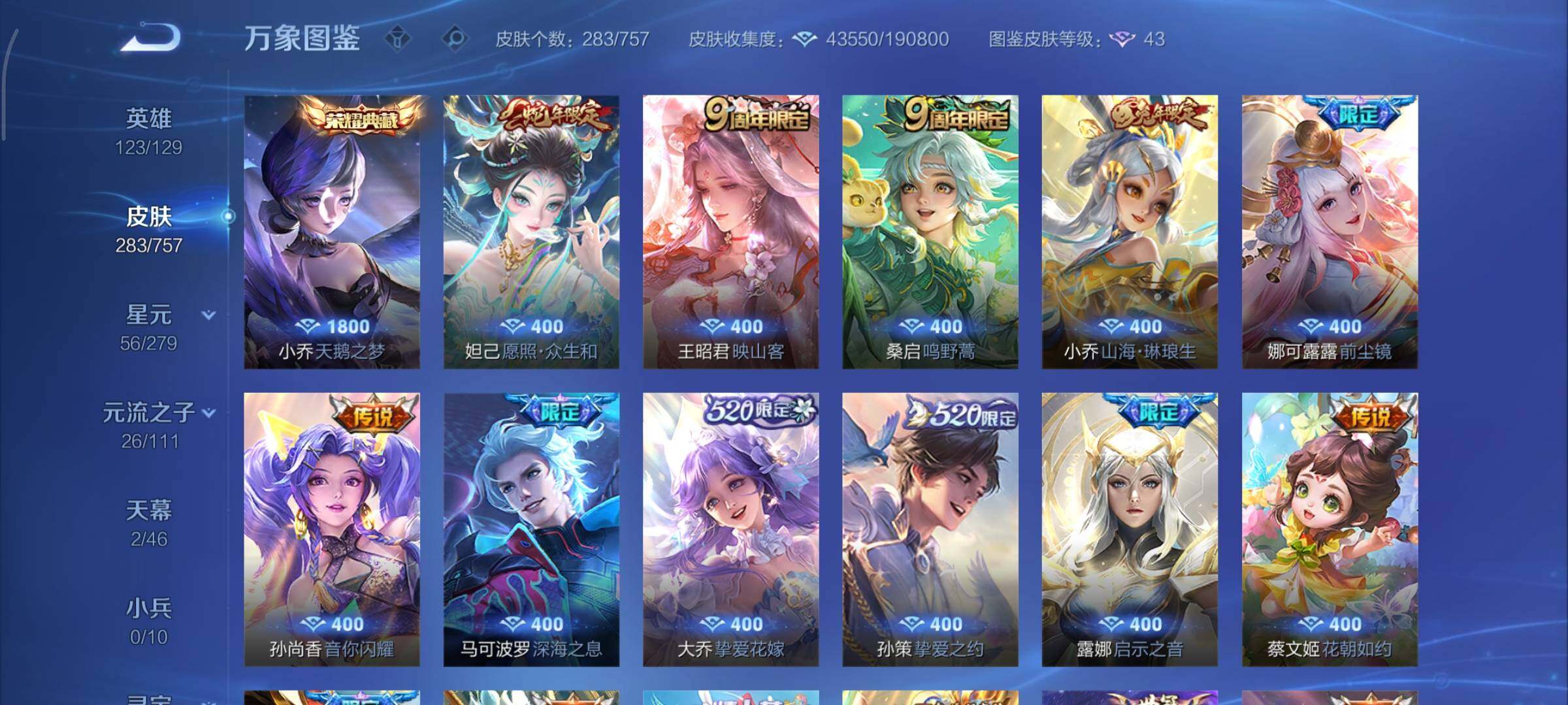 可换绑【精品女号 小乔典藏 蛇年妲己 小乔兔年 520大乔孙策 女娲补天 瑶时