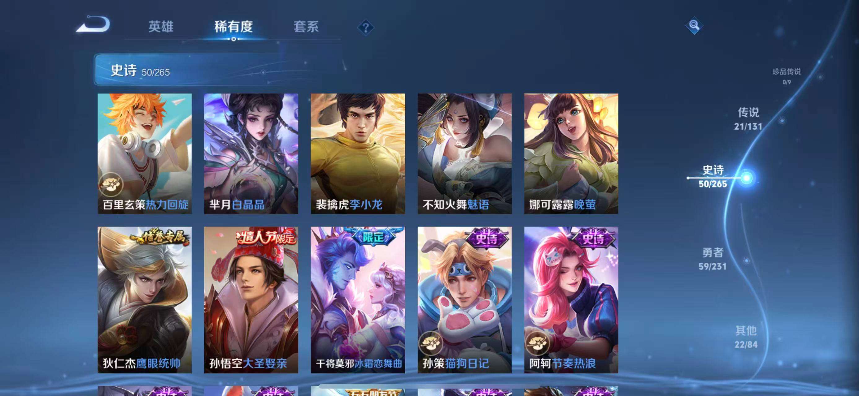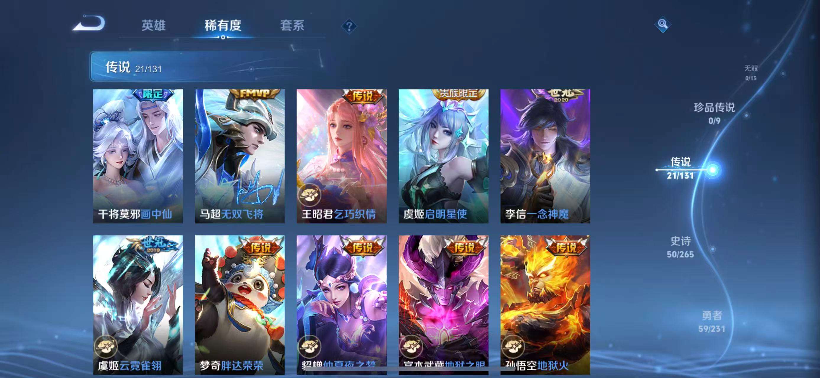 【传说皮肤】 千山共赴 群星魔术团 神树通天 惊梅引 逐花归海 死亡执政官 战鼓燎原 愿照·山河定 祥瑞亨通 万灵伏威 画中仙 无双飞将 超时空战士 仲夏夜之梦 地狱之眼 一念神魔 胖达荣荣 地狱火 乞巧织情 云霓雀翎 启明星使 【史诗皮肤】 飞车小橘子 战舞者 冰霜恋舞曲 器灵·浮梦炉 布丁狗之约 谧流熔炉 白晶晶 大圣娶亲 至尊宝 鸭鸭历险记 龙之律动 地狱燃心 浮光幕影