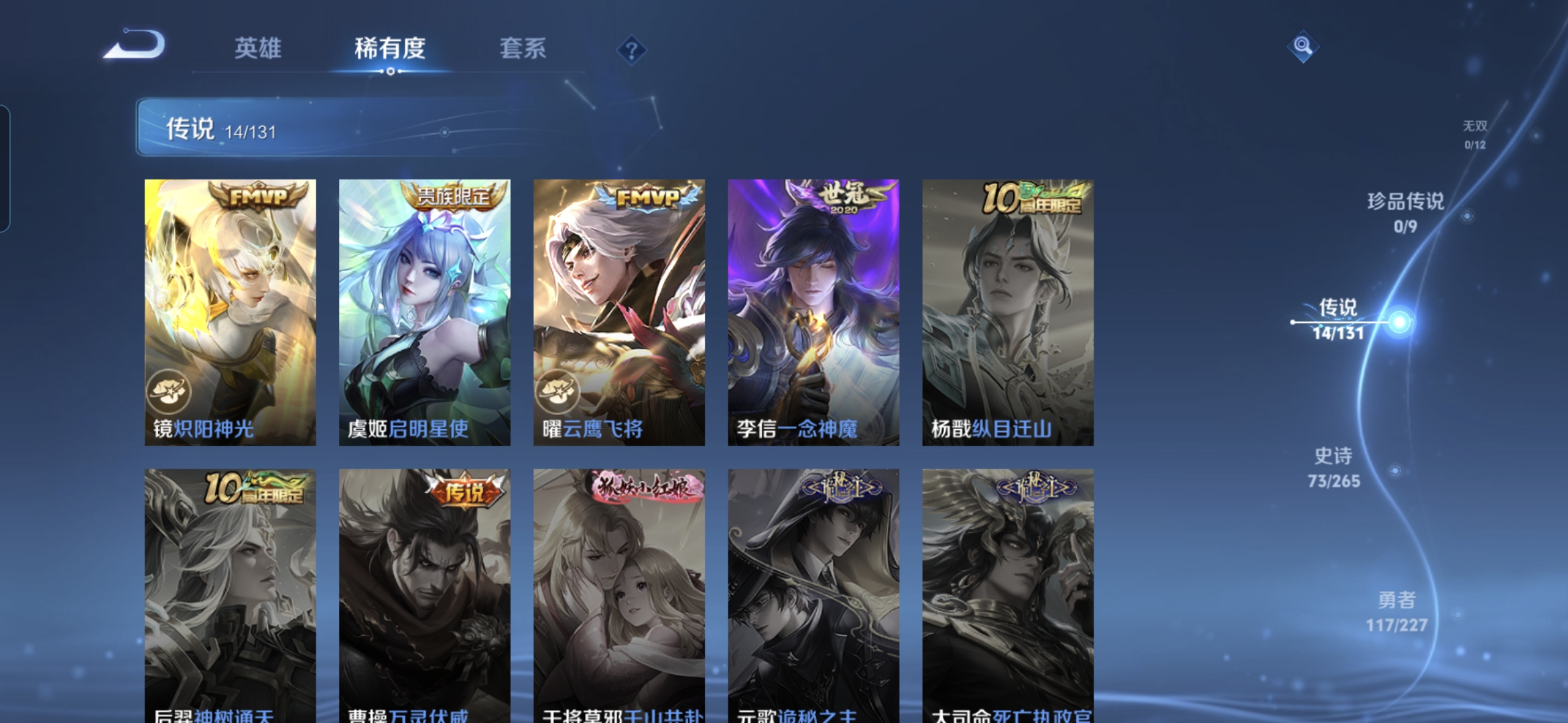 【传说皮肤】 鸣野蒿 曦玄引 愿照·岁时盈 映山客 画中仙 齐天大圣 诗剑行 炽阳神光 一念神魔 寅虎·瑞焰 末日机甲 云鹰飞将 启明星使 时雨天司