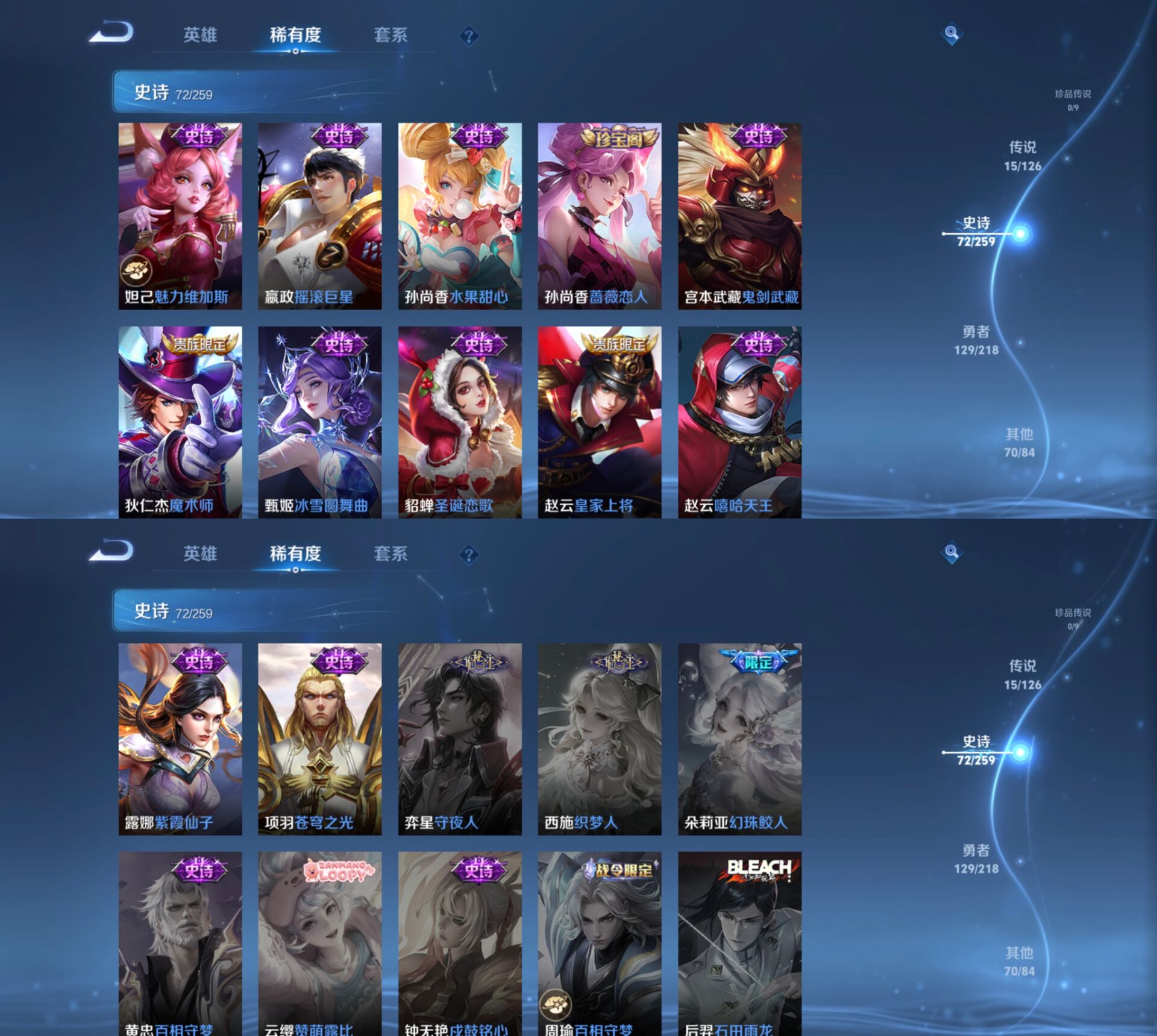 【史诗皮肤】 如梦令 破空之剑 茶境仙 星界战将 冰锋战神 飞衡 如梦令 青春决赛季 默契交锋 布丁狗之约 谧流熔炉 一生所爱 天狼狩猎者 大圣娶亲 至尊宝 青