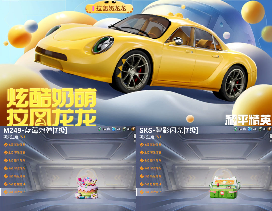特效枪7:M249-蓝莓炮弹7级,sks-碧莹闪光7级,SCAR-L-锦绣绵绵5级,GROZA-镜光银凌5级,KAR98K-巳巳如意5级,AUG-暖羊咩咩5级,DP-28-豹影疾电5级,