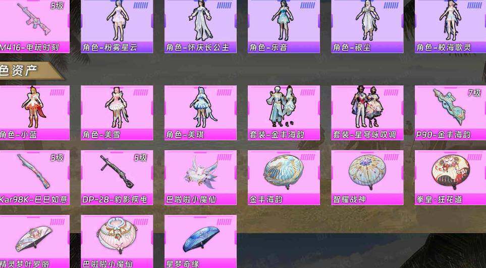 【粉色枪皮等级】:M416-电玩时刻(五级),P90-金丰海韵(七级),Kar98K-巳巳如意(五级),DP-28-豹影疾电(五级)