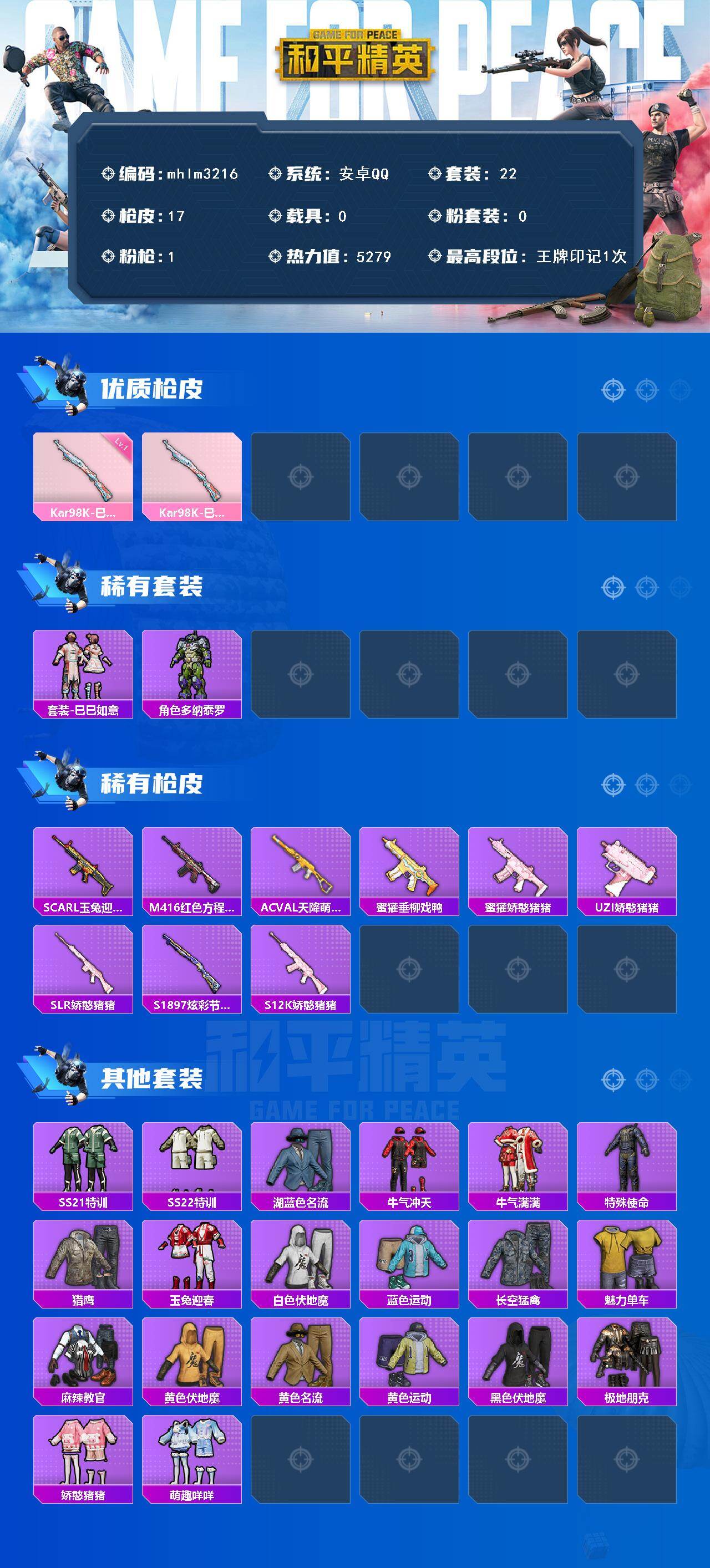 【mhlm3216】安卓 手Q-0粉装-1特效枪-0载具-0粉色飞行器-5279热力值-1王牌印记-22套装-17枪皮