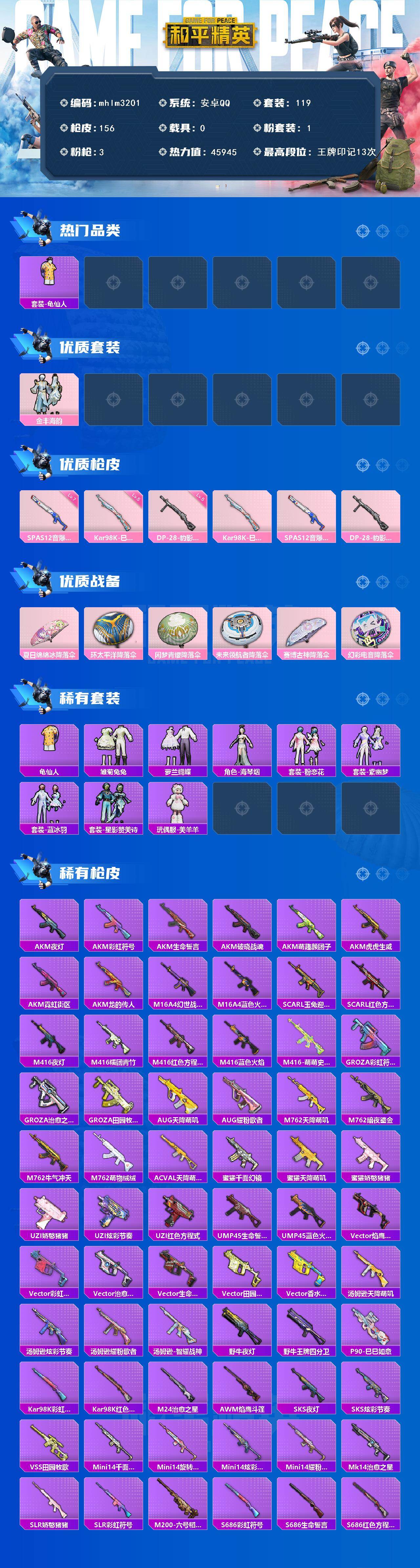 【mhlm3201】安卓 手Q-1粉装-3特效枪-0载具-0粉色飞行器-45945热力值-13王牌印记-119套装-156枪皮