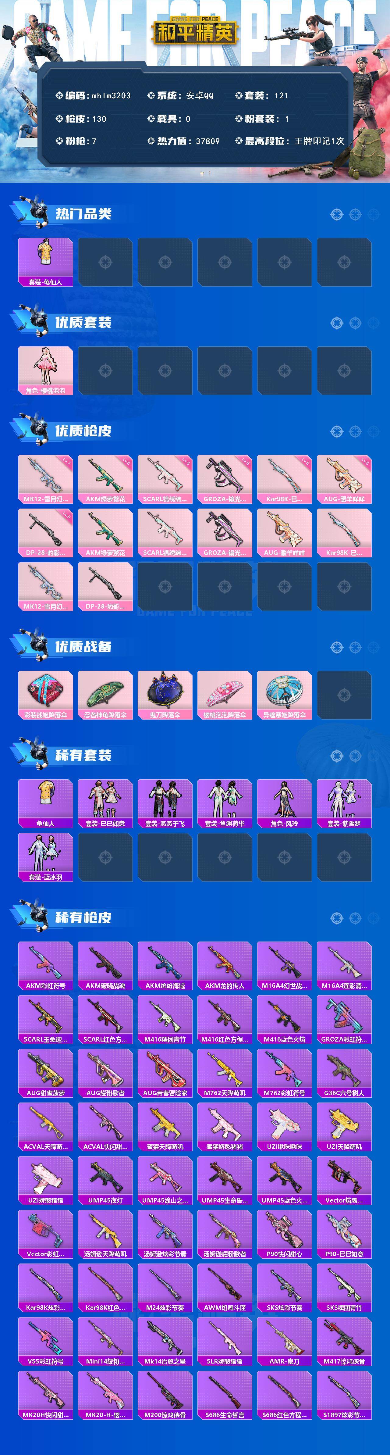 【mhlm3203】安卓 手Q-1粉装-7特效枪-0载具-0粉色飞行器-37809热力值-1王牌印记-121套装-130枪皮