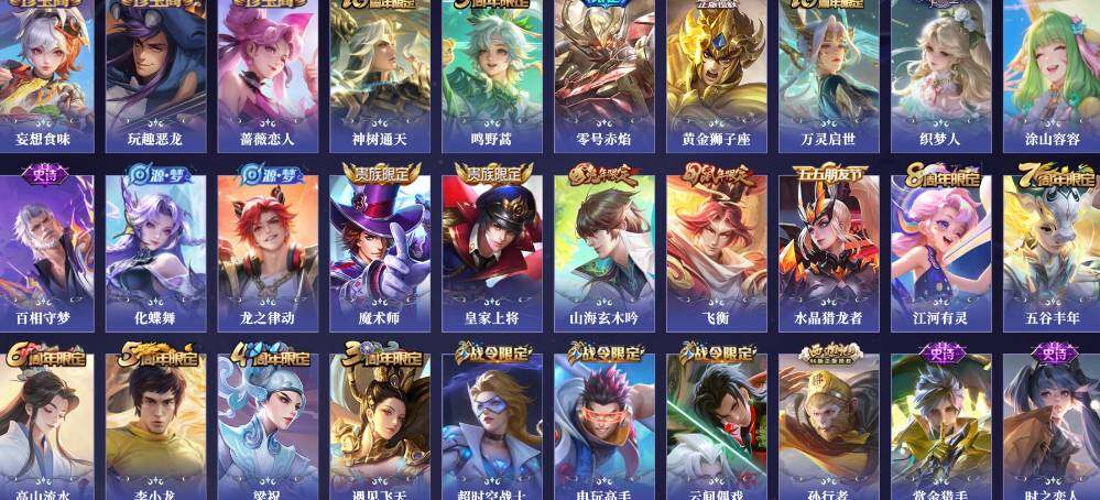 【限定皮肤】:姜子牙天穹之誓,狄仁杰阴阳师,赵云皇家上将,孙尚香蔷薇恋人,庄周高山流水,高渐离玩趣恶龙,钟无艳超时空战士,元歌云间偶戏,元歌无心,夏侯惇朔风刀,甄姬落雪兰心,马可波罗山海玄木吟