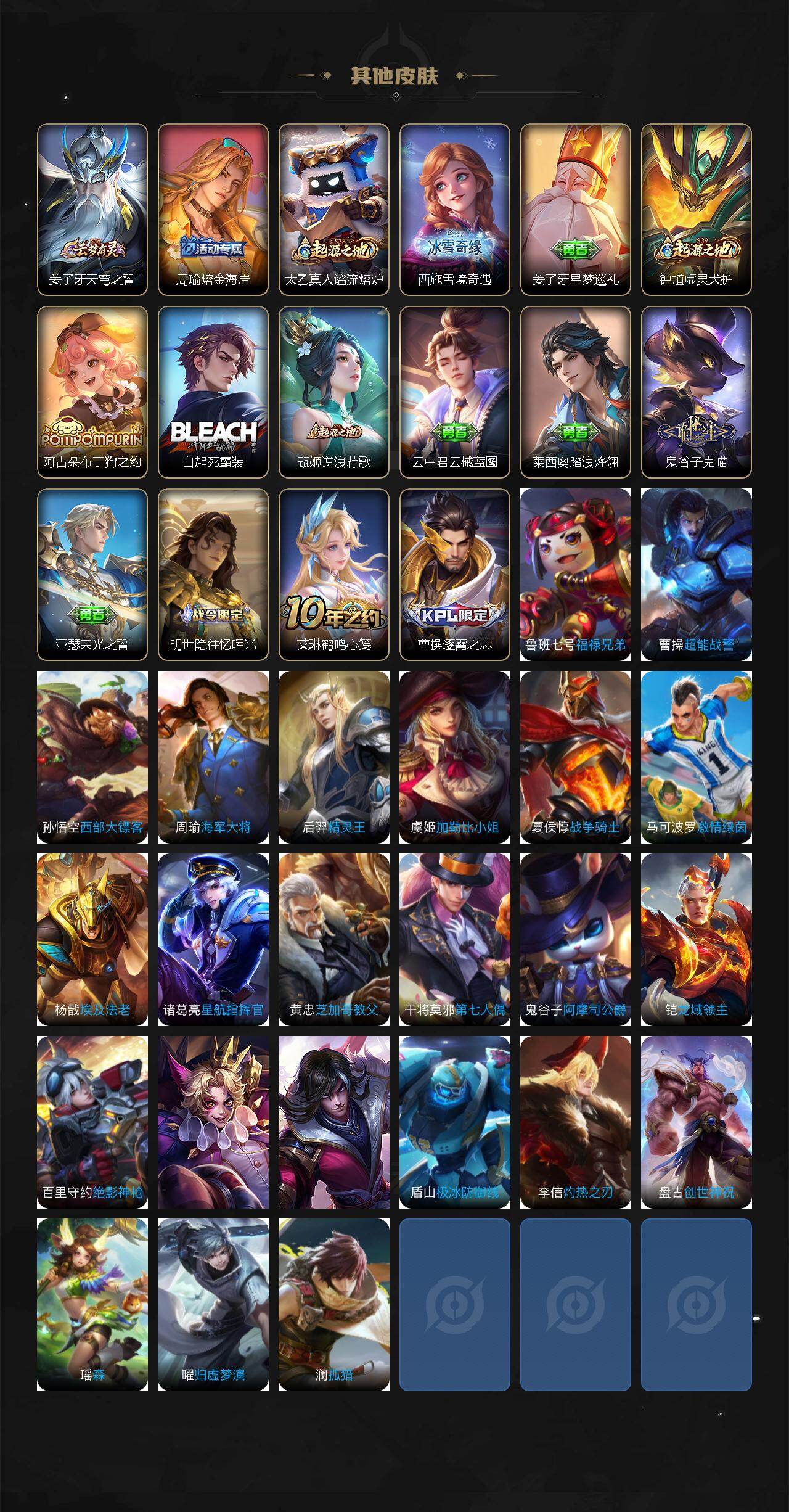 【限定皮肤】:姜子牙天穹之誓,狄仁杰阴阳师,赵云皇家上将,项羽海滩派对,王昭君午后时光,李元芳云中旅人,鬼谷子五谷丰年,沈梦溪大漠名商,裴擒虎擒涛扼浪,鲁班大师探海日志,桑启海盐诗旅,张良古海寻踪,鬼谷子天穹祈灯,刘邦剑破