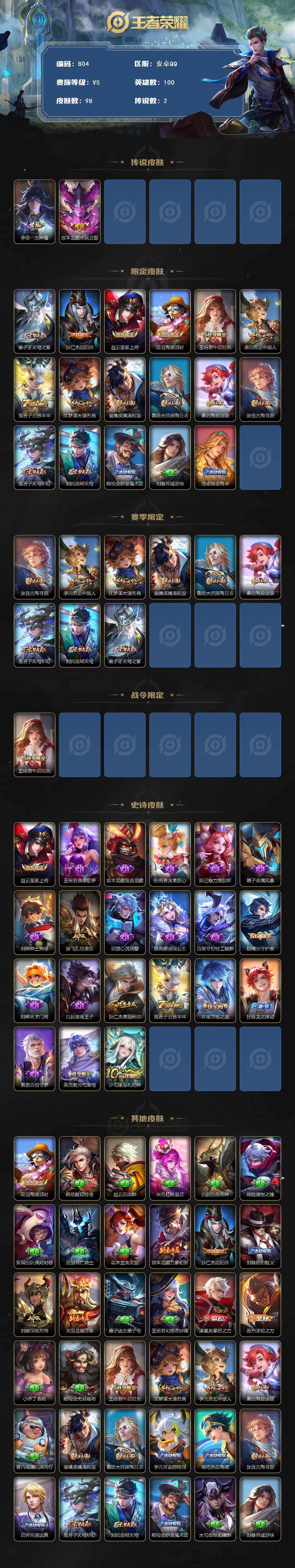 1941071 王者荣耀账号 安卓Q-V5-最强王者段位-100英雄-98皮肤-2传说-21史诗