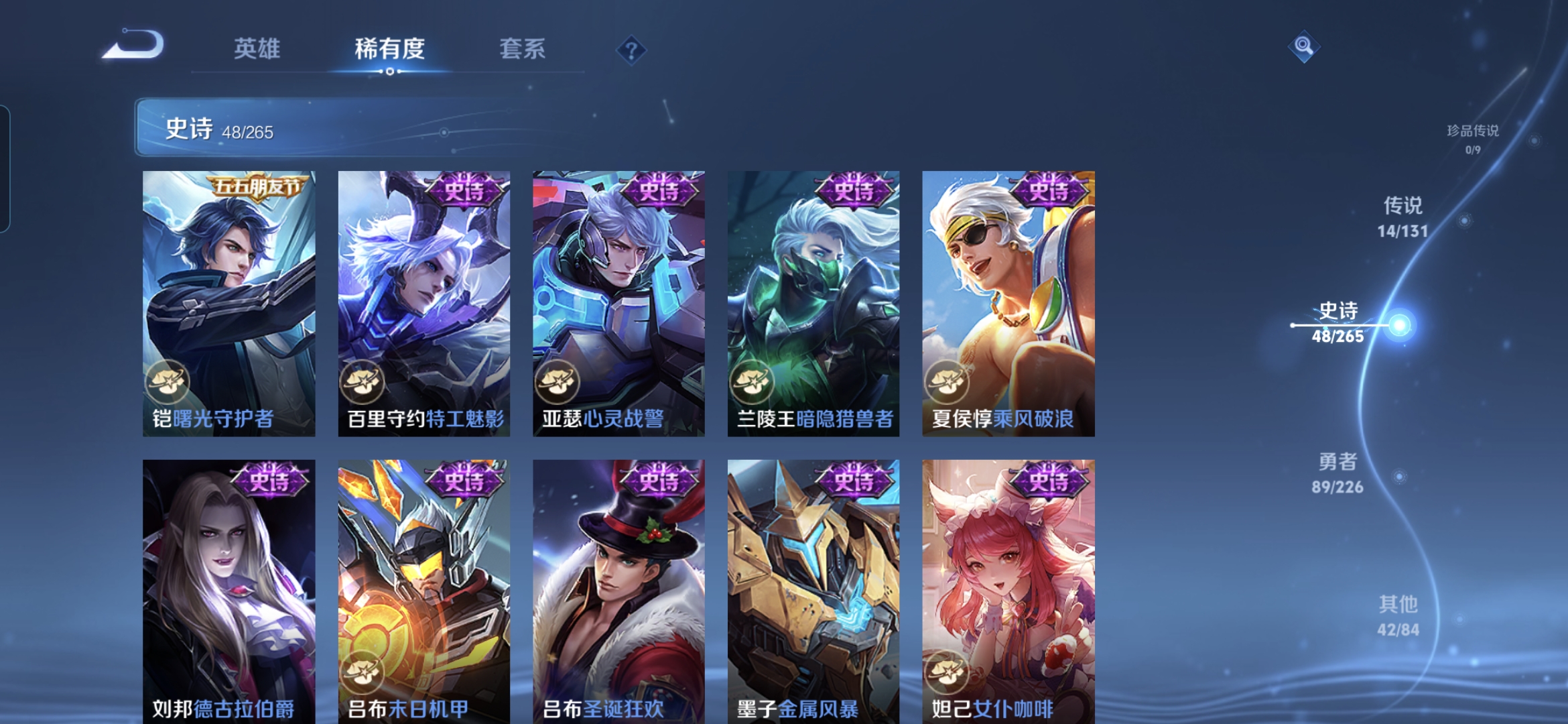 【史诗皮肤】 岱宗 玫瑰异探 地狱燃心 山海·玄木吟 山海·碧波行 王牌新星 聚星闪耀 江河有灵 幻夜行动 百解令 荣光圣徽 超时空战士 奇幻香踪 星界游侠 顽趣 驭风魔法 舞动绿茵 女仆咖啡 魔术师 鹰眼统帅 鬼剑武藏 修罗 曙光守护者 暗隐猎兽者 德古拉伯
