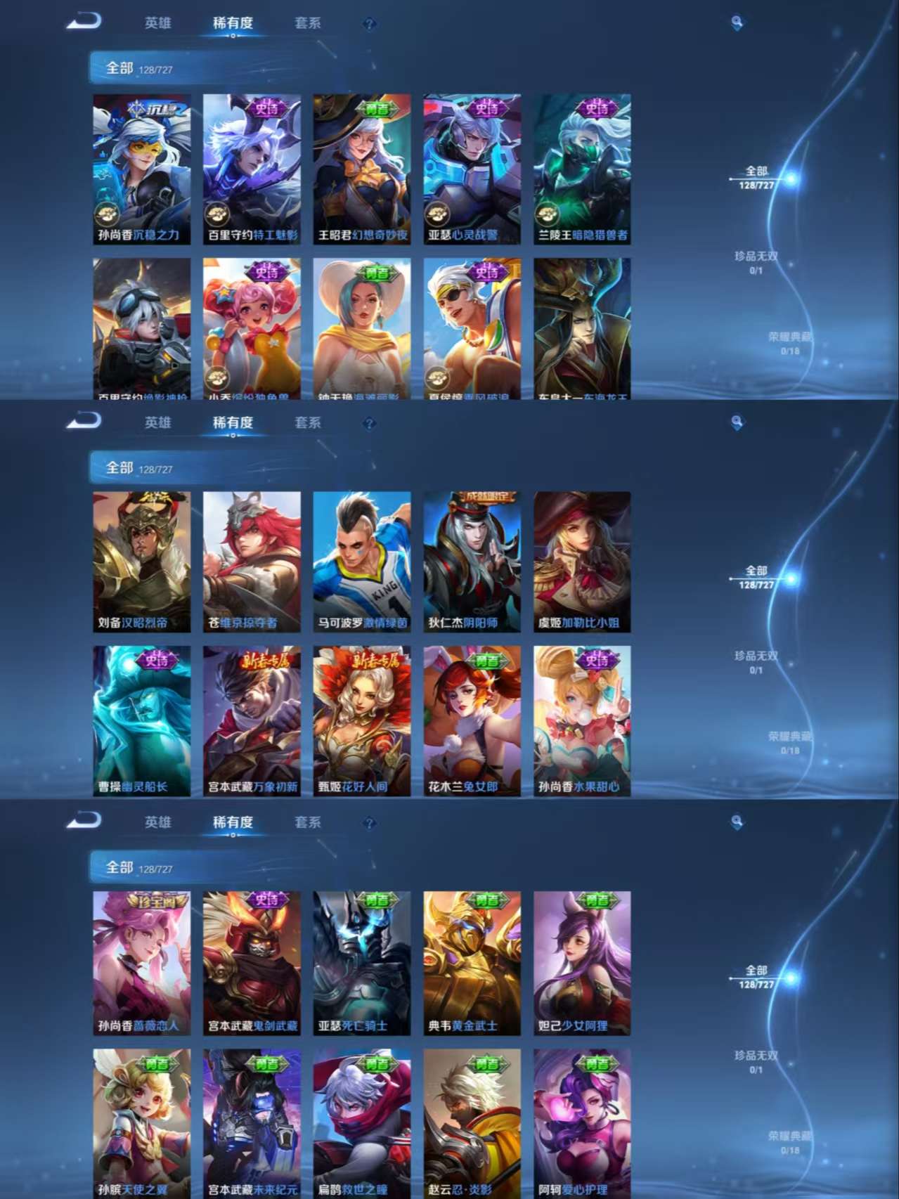 【史诗皮肤】 百解令 心灵战警 五谷丰年 无心 鬼剑武藏 龙之律动 怒海争锋 无限星赏官 拒霜思 鹰眼统帅 特工魅影 猫狗日记 逐浪之夏 顽岩魄 怒海争锋 器灵·浮梦炉 蔷薇恋人 节奏热浪 缤纷独角兽 水果甜心 化蝶舞 江河有灵 幽灵船长 乘风破浪