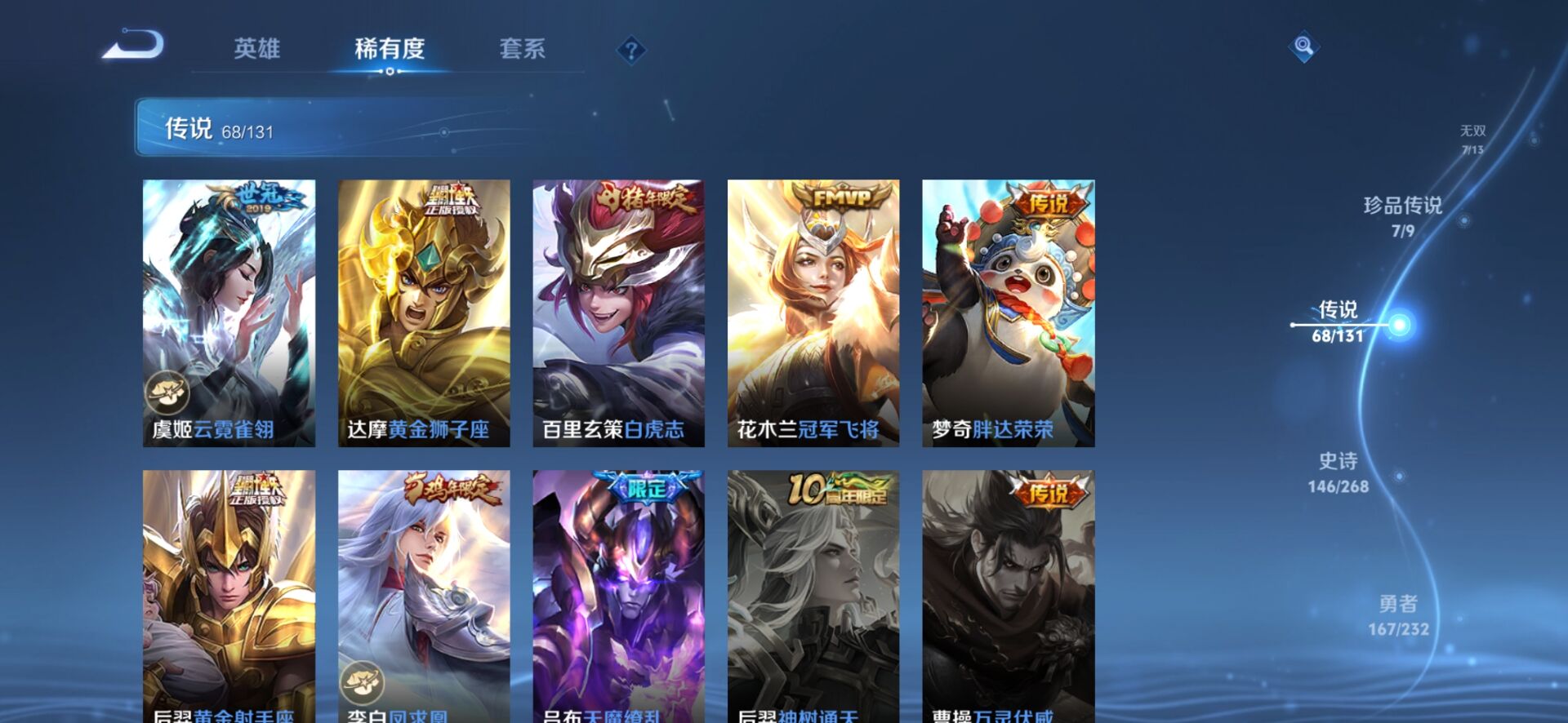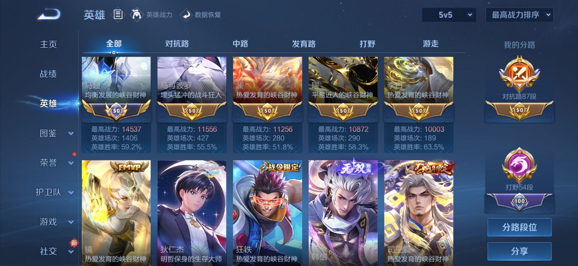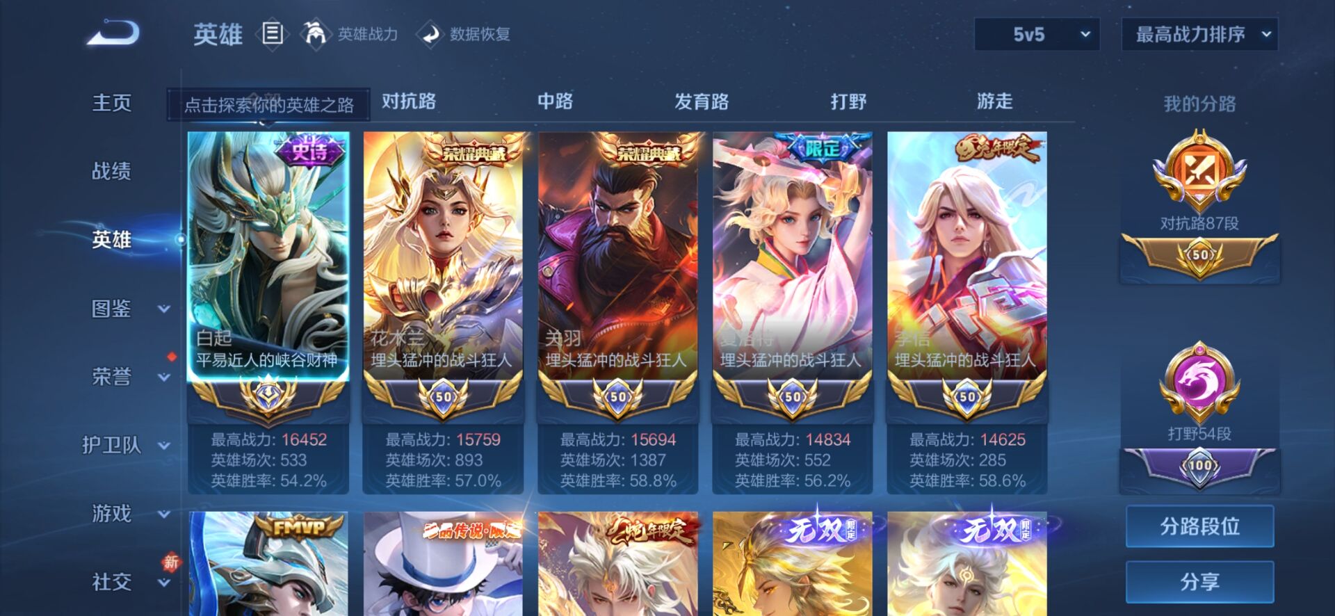低价出历史大国标白起 小国标李信夏洛特花木兰马超关羽 10个万战顶级战力一手号 对抗路87段 打野54 4典藏 7无双 7珍品传说 68传说