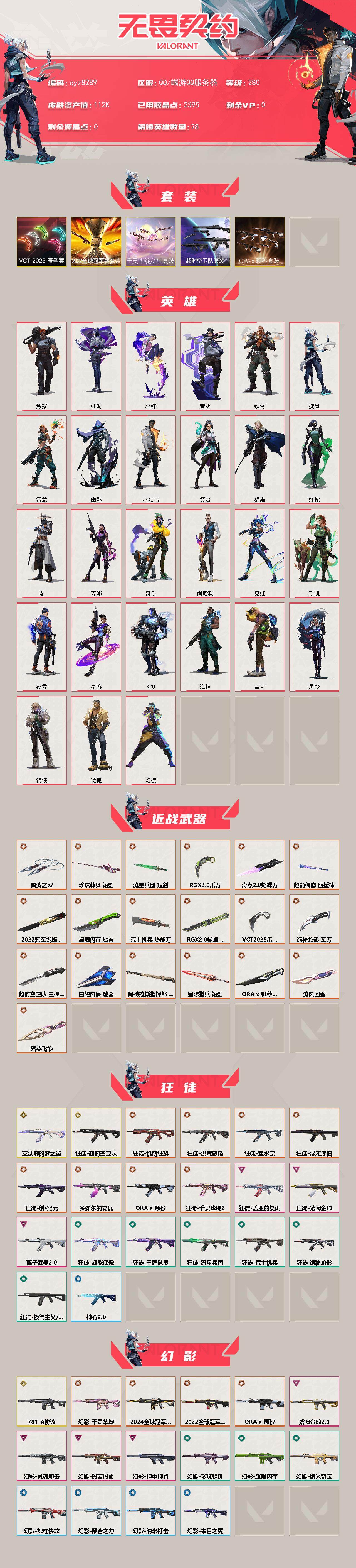 【qyz8289】精品大库存 低价出 喜欢的来吧嘎嘎合适 qyz8289 亮点皮肤: 幻影-2024全球冠军赛,幻影-2022全球冠军赛,蝴蝶刀-2022全球冠军赛 套装: VCT 2025赛季礼包,2022全球冠军赛,超时空卫队 近战武器皮肤: 黑波之刃,短剑-珍珠棘贝,落英飞旋,超能偶像 应援棒,爪刀-RGX 11z Pro 3.0,短剑-流星兵团,匕首-超限闪存,蝴蝶刀-奇点//2.0,荒土机兵热能刀,RGX 11z Pro//2.0 蝴蝶刀,VCT 2025 爪刀,诡秘蛇影,超时空卫队