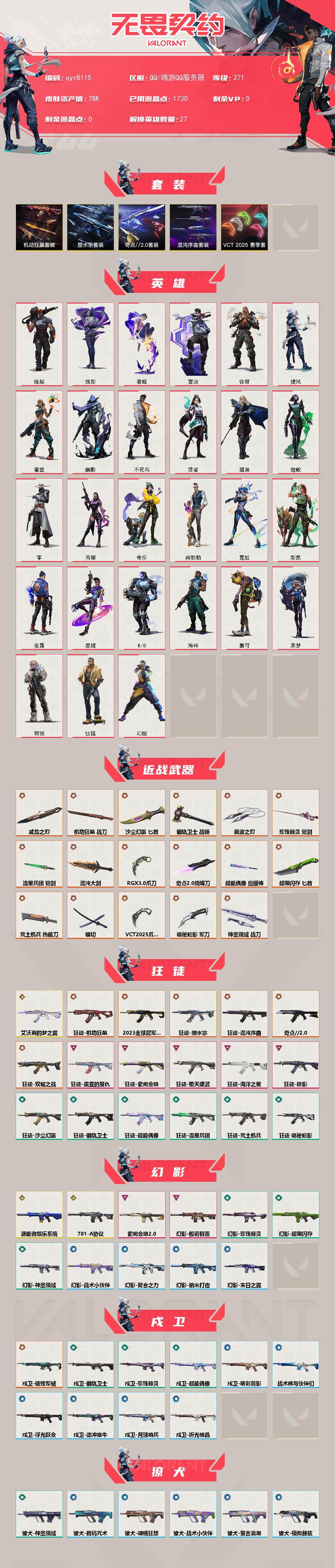 【qyz8115】精品特价号 喜欢的来吧 嘎嘎合适 qyz8115 亮点皮肤: 狂徒-2023全球冠军赛 套装: 机动狂飙套装,塑水宗套装,混沌序曲套装,奇点//2.0套装,VCT 2025赛季礼包 近战武器皮肤: 匕首-沙尘幻旅,机动狂飙战刀,黑波之刃,威龙之刃,短剑-珍珠棘贝,超能偶像 应援棒,爪刀-RGX 11z Pro 3.0,混沌大剑,短剑-流星兵团,战锤-钢轨卫士,匕首-超限闪存,蝴蝶刀-奇点//2.0,荒土机兵热能刀,镭切,神圣领域 战刀,VCT 2025 爪刀,诡秘蛇影 步枪皮肤