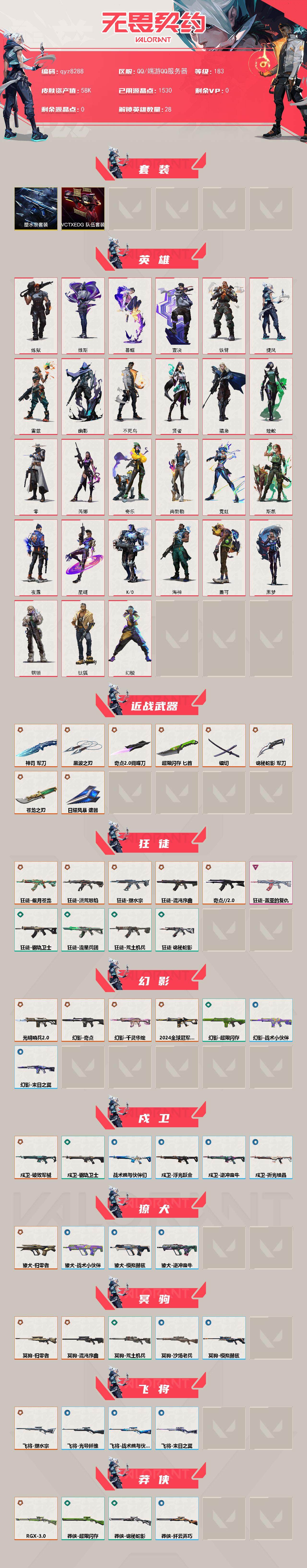 【qyz8288】24m4 塑水一套 5周年小刀 qyz6922 亮点皮肤: 幻影-2024全球冠军赛 套装: 塑水宗套装,VCTCN2025套装 近战武器皮肤: 军刀-神罚,黑波之刃,匕首-超限闪存,蝴蝶刀-奇点//2.0 qyz8288 亮点皮肤: 幻影-2024全球冠军赛 套装: 塑水宗套装,VCTCN2025套装 近战武器皮肤: 军刀-神罚,黑波之刃,匕首-超限闪存,蝴蝶刀-奇点//2.0,镭切,诡秘蛇影,苍龙之刃 步枪皮肤: 幻影-奇点,狂徒-盖亚的复仇,狂徒-偃月苍龙,獠犬-归零者,