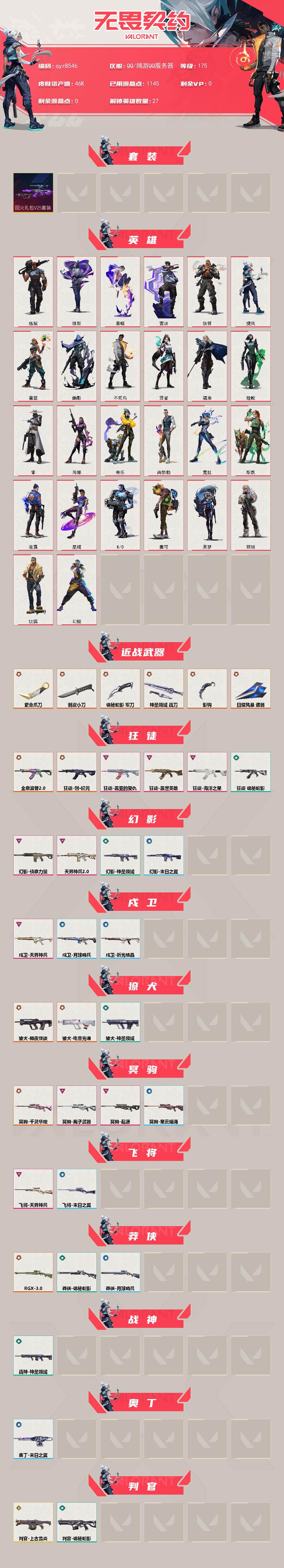 【qyz8546】4wvp 黄金三 qyz8546 近战武器皮肤: 剥皮小刀-异形猎人,紫金爪刀-紫阙金琅//2.0,神圣领域 战刀,诡秘蛇影,日耀风暴,影钩-掠影2.0 步枪皮肤: 狂徒-盖亚的复仇,幻影-侦察力量,戍卫-天界神兵,狂徒-盖世英雄,幻影-天界神兵2.0,狂徒-海洋之星,狂徒-全息波普//2.0,獠犬-黯夜怪谈,狂徒-创·纪元,獠犬-电音光谱 佩枪皮肤: 正义-奇点,短炮-归零者,鬼魅-耀鳞威龙,鬼魅-源能者娱乐系统,标配-VCT25xTS,正义-西部未来,标配-电音光谱 狙击枪