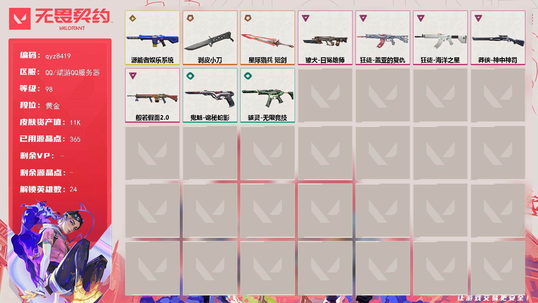 【qyz8419】黄金小号剥皮+盖亚都是热门皮 qyz8419 近战武器皮肤: 剥皮小刀 步枪皮肤: 狂徒-盖亚的复仇,狂徒-海洋之星,幻影-源能者娱乐系统,獠犬-日冕雄师 狙击枪皮肤: 莽侠-神中神罚 机枪皮肤: 战神-般若假面//2.0 亮点: 【qyz8419】【英雄】:幻棱,炼狱,暮蝶,钛狐,壹决,铁臂,捷风,雷兹,不死鸟,贤者,猎枭,蝰蛇,零,芮娜,奇乐,尚勃勒,霓虹,夜露,K/O,海神,盖可,黑梦,钢锁【近战武器】:近战武器-剥皮小刀,近战武器-星际猎兵 短剑【狂徒】:狂徒-盖亚的复