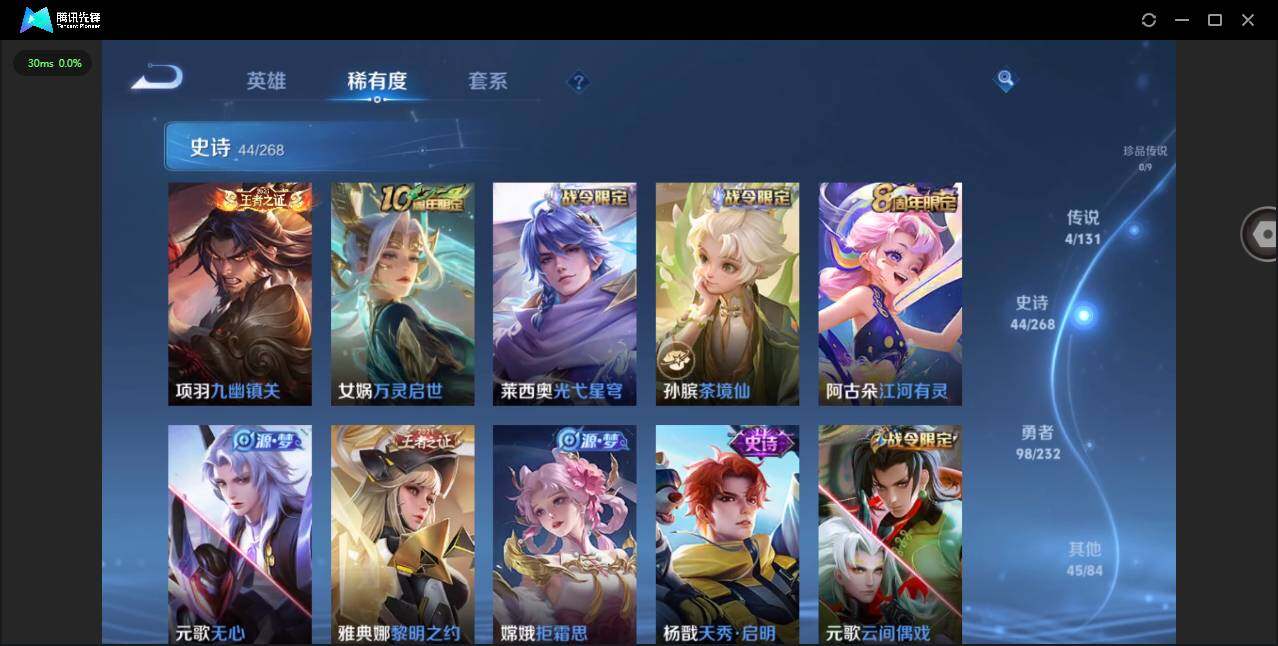 贵族等级: V6 英雄数: 126 皮肤数: 191 星传说: 未来机甲 传说皮: 黄金狮子座,黄金射手座,澜逐花归海 限定皮: 李小龙,梁祝,天狼征服者,至尊宝,愿照·九州拓