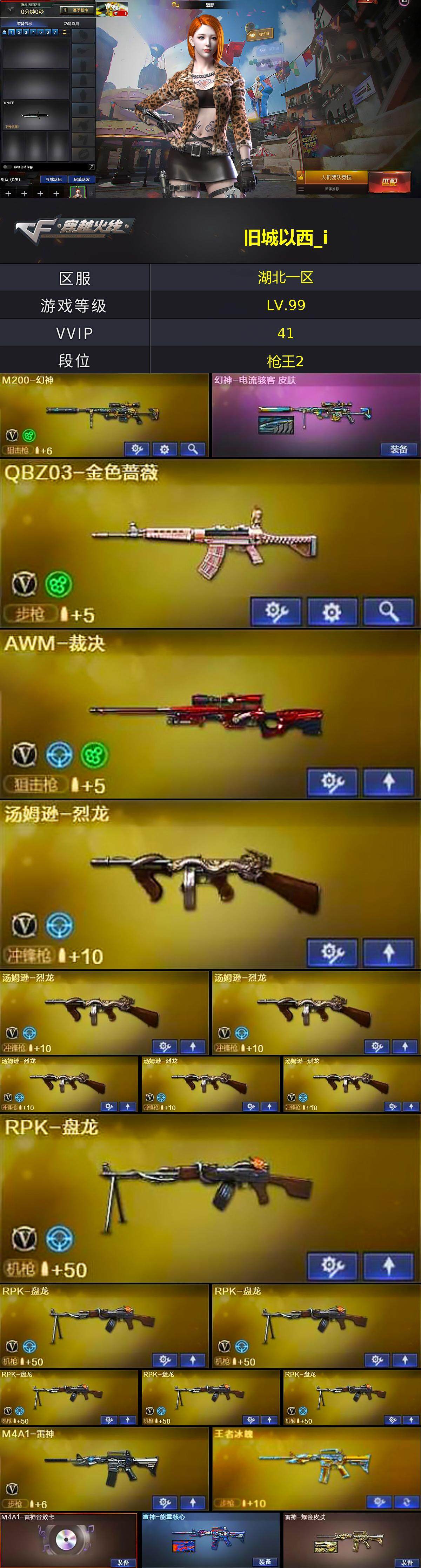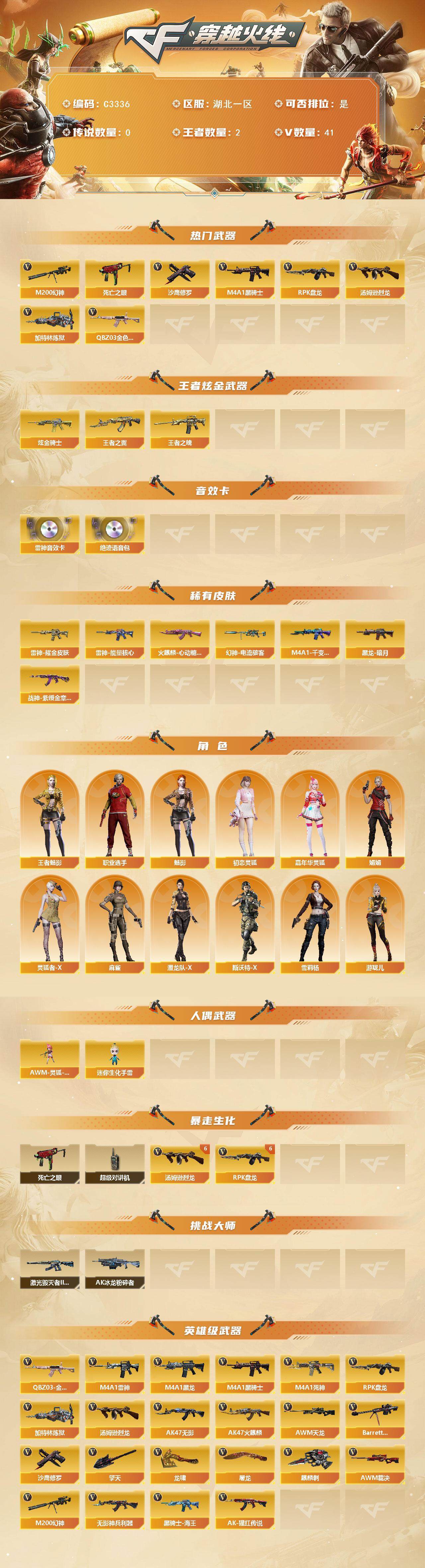 【C3336】湖北一区-41V-2王者-2炫金6烈龙】【死亡之眼】【6盘龙】【M200-幻神】【幻神-电流骇客 皮肤】【AWM-裁决】【QBZ03-金色蔷薇】【加特林-炼狱】【RPK-盘龙】【汤姆逊-烈龙】【死亡之眼】【王者-魅影】【魅影】【M4A1-雷神】【雷神-能量核心】【雷神-耀金皮肤】【M4A1-雷神音效卡】【AK47-火麒麟】【火麒麟-心动糖果】【火麒麟-CFSTAR】【M4A1-黑骑士】【M4A1-黑龙】【黑龙-暗月】【Barrett-毁灭】