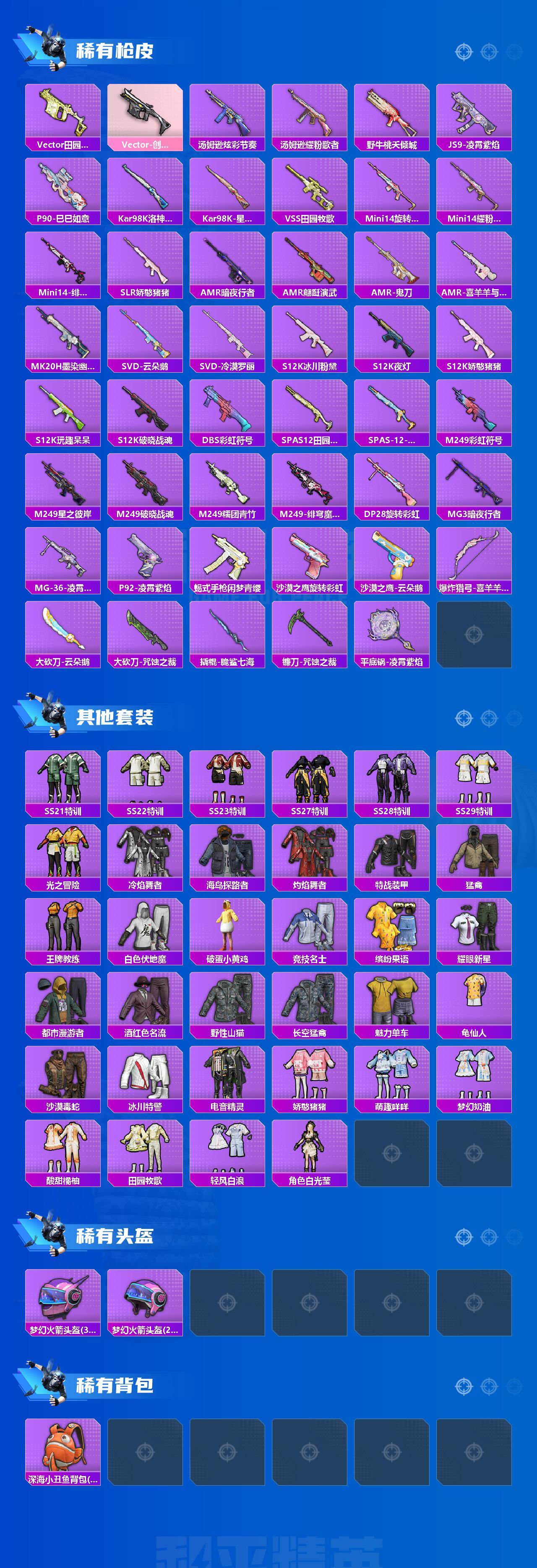 【粉色枪皮等级】:GROZA-旋转彩虹(五级),蜜獾-异瞳寒姬(四级),Vector-绯穹魔姬(六级),Kar98K-巳巳如意(五级),Mk14-甜梦熊击(五级),DP-28-豹影疾电(五级),MG3-洛