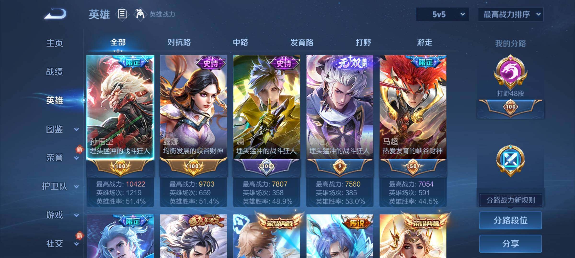 可换绑【V10精品号 打野48段 金标万战孙悟空 露娜金标 6典藏 2无双 多