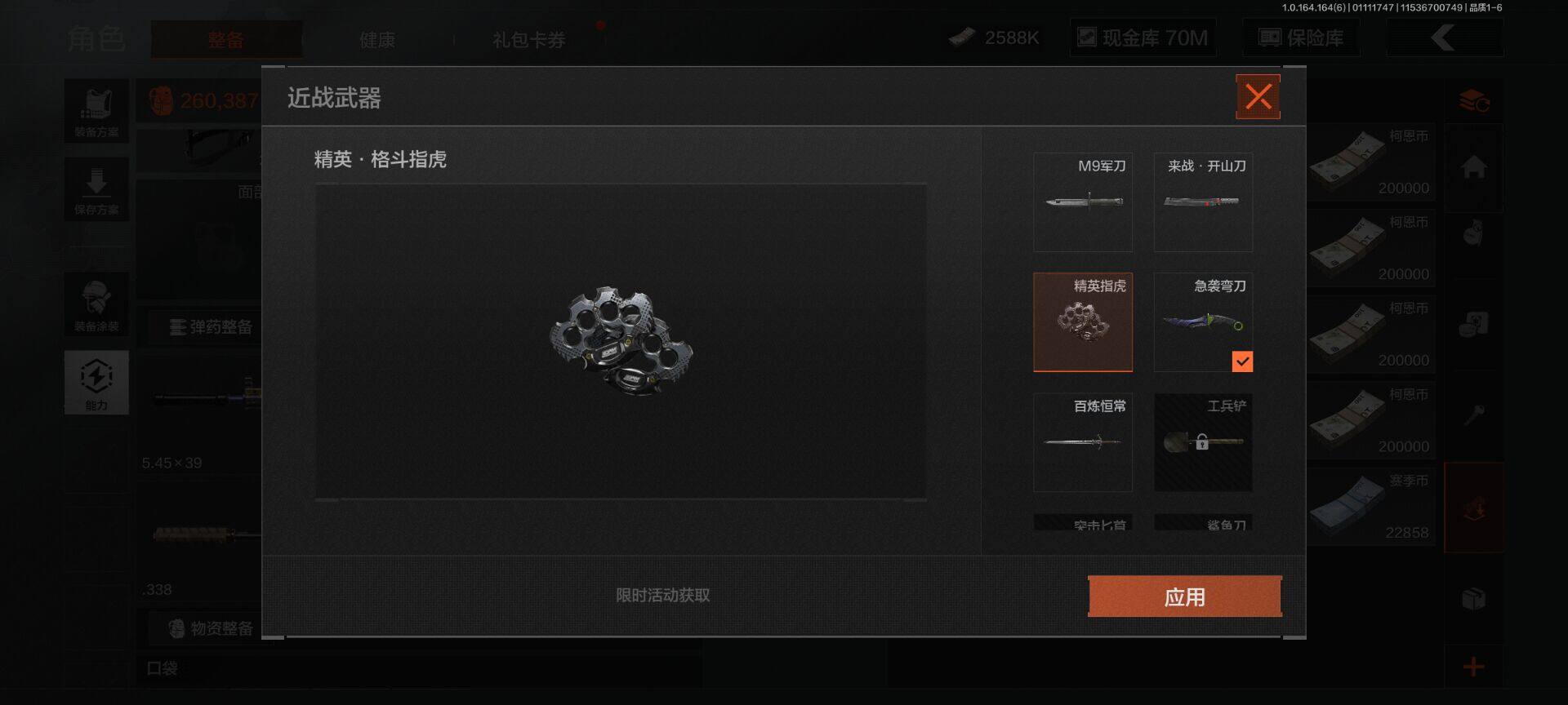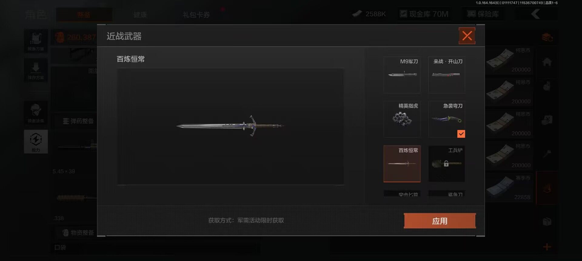 仓库价值(百万):80.3/柯恩币:70000000/急袭弯刀