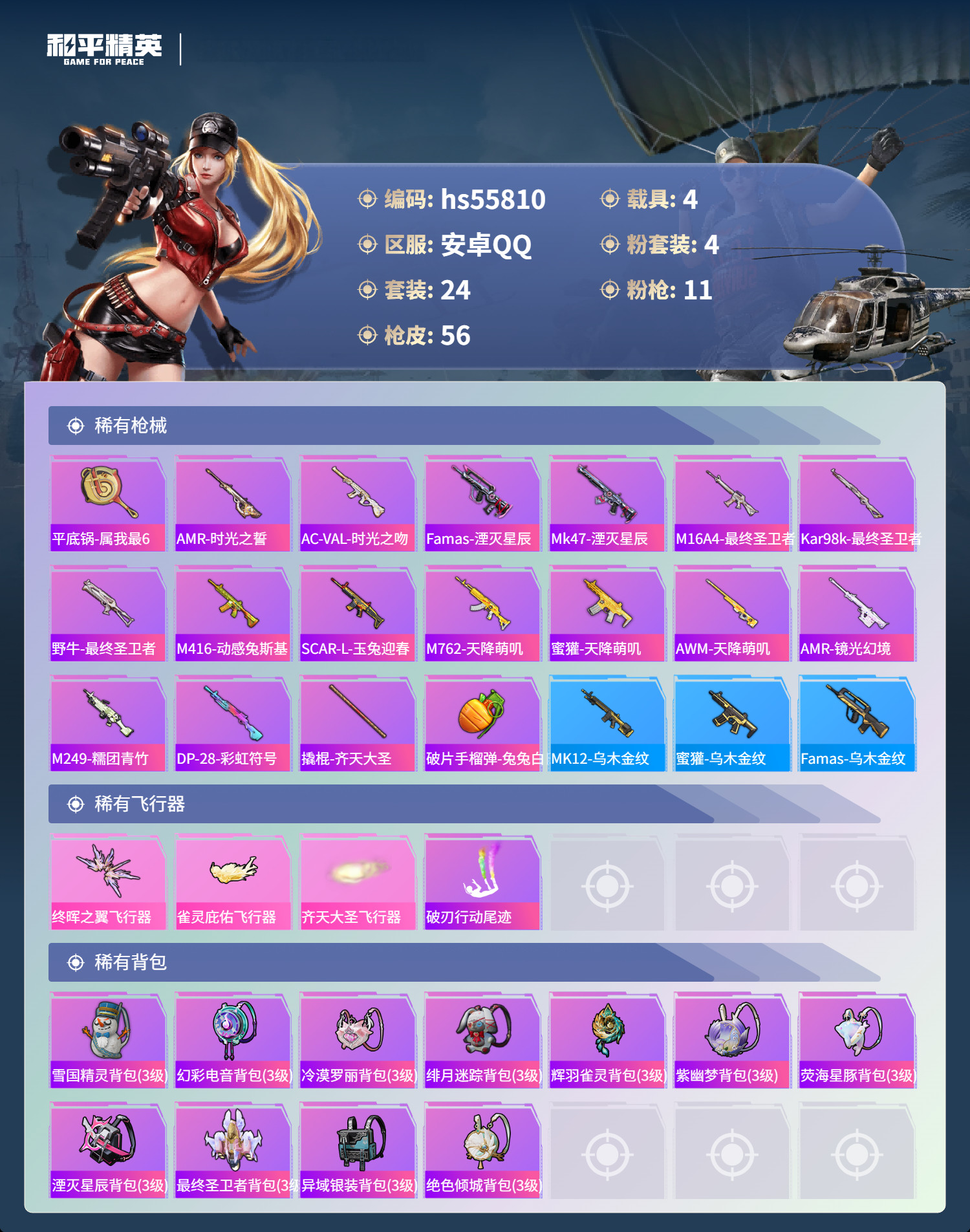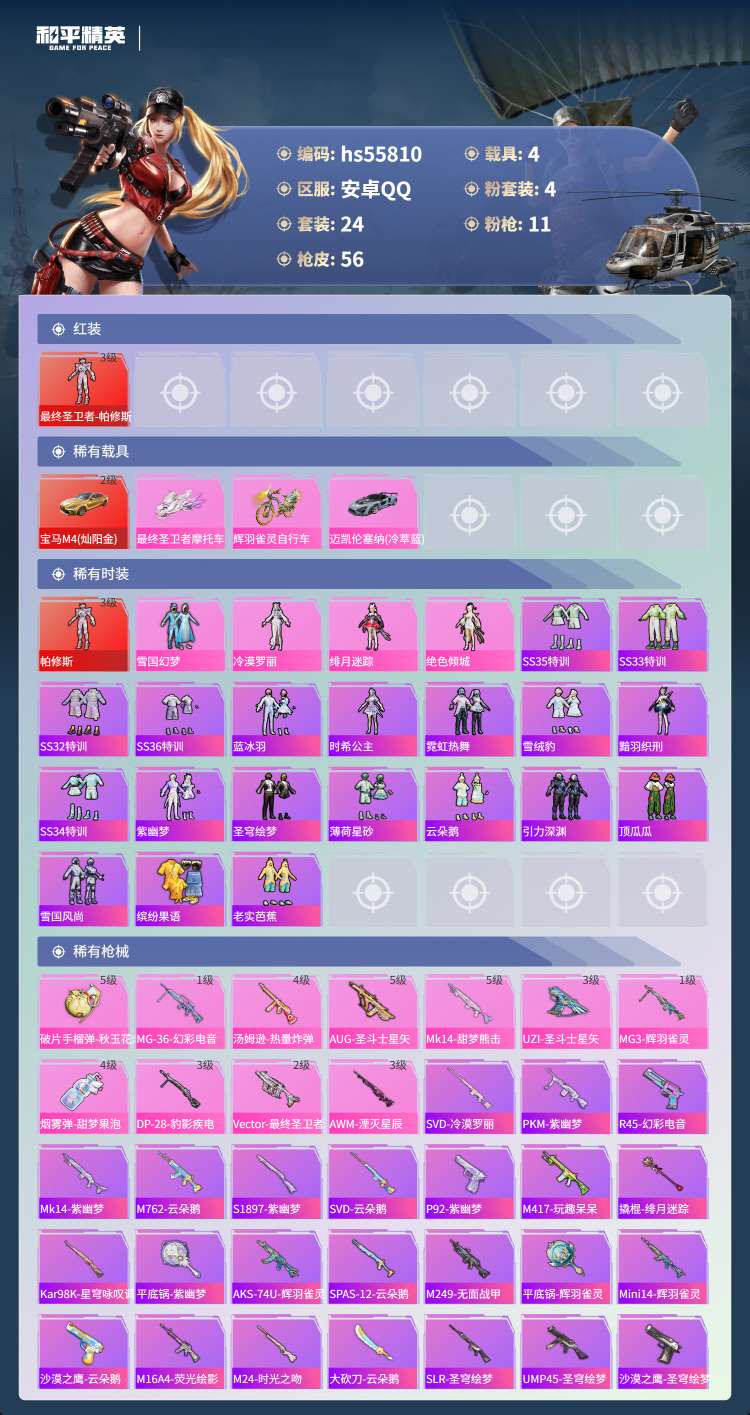 hs55810 安卓手Q-1王牌印记-1红装-4粉装-11特效枪-4载具-27773热力值-24套装