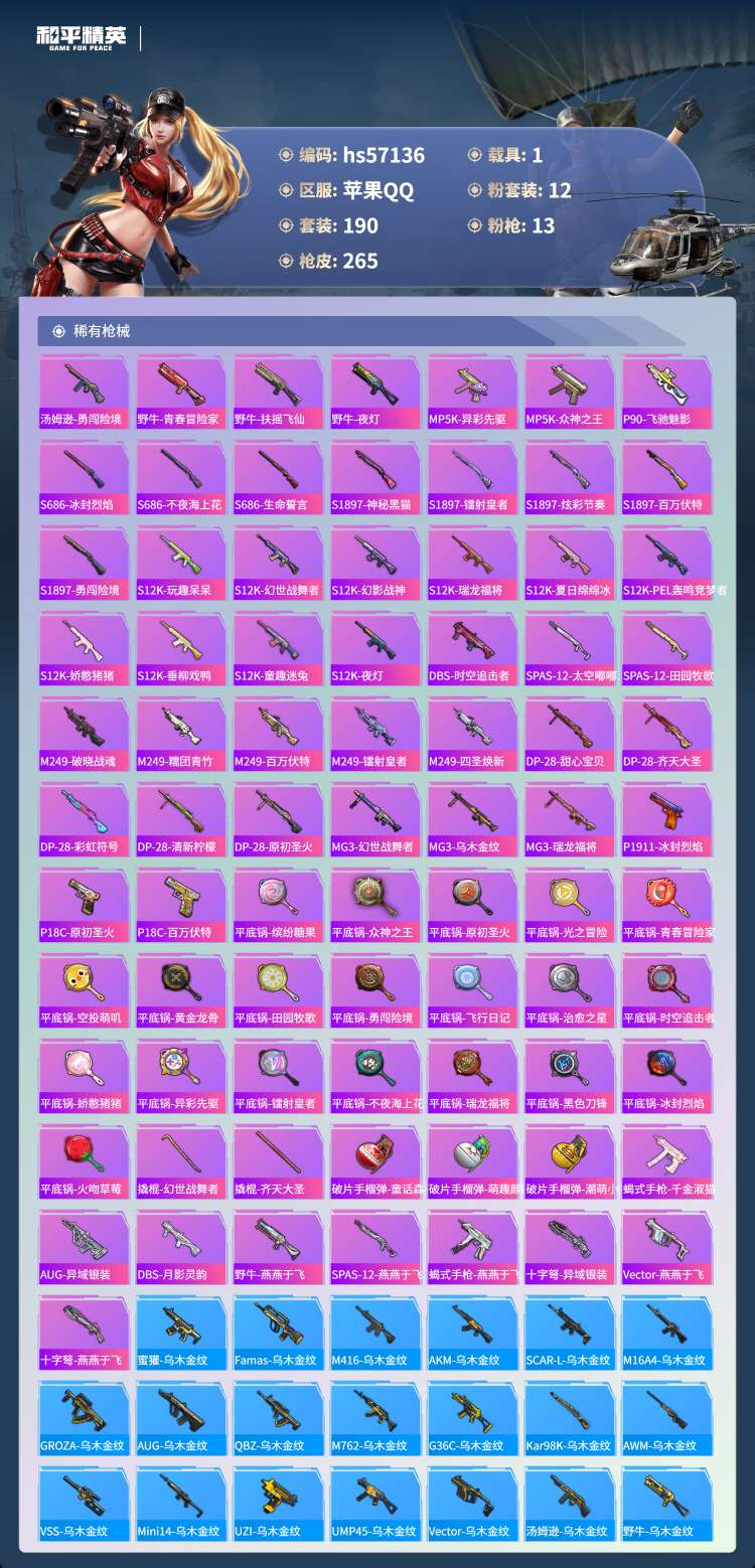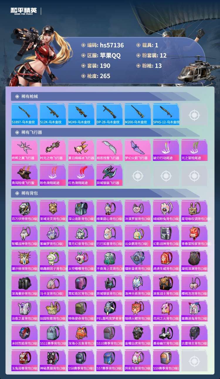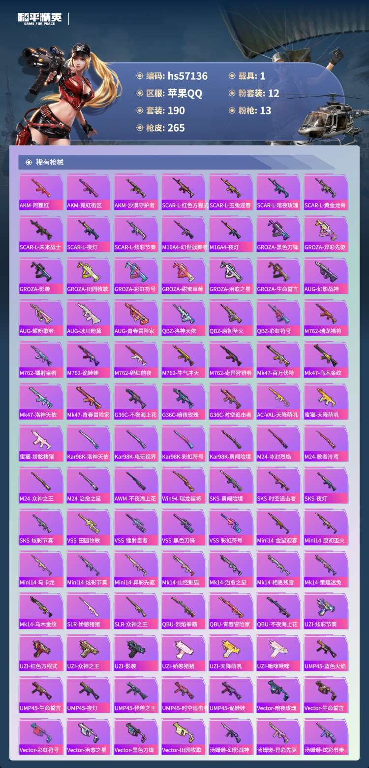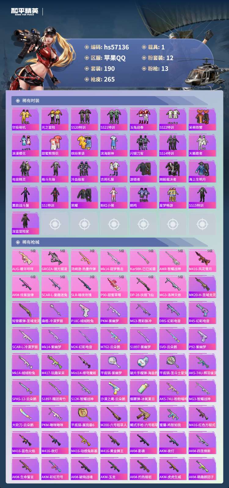 hs57136 苹果手Q-17王牌印记-12粉装-13特效枪-1载具-85065热力值-190套装-