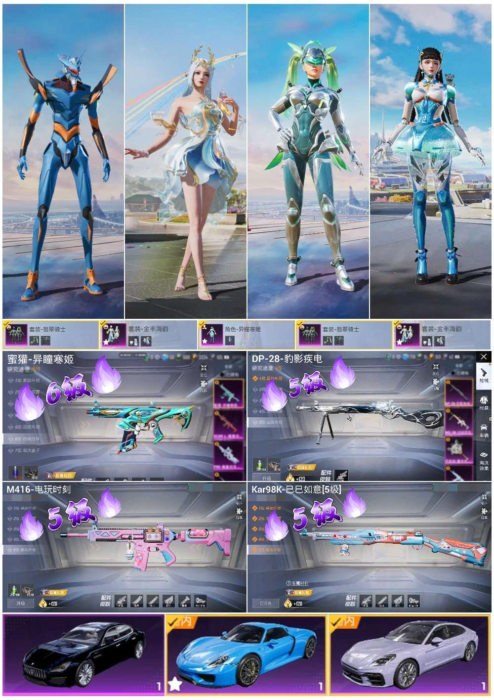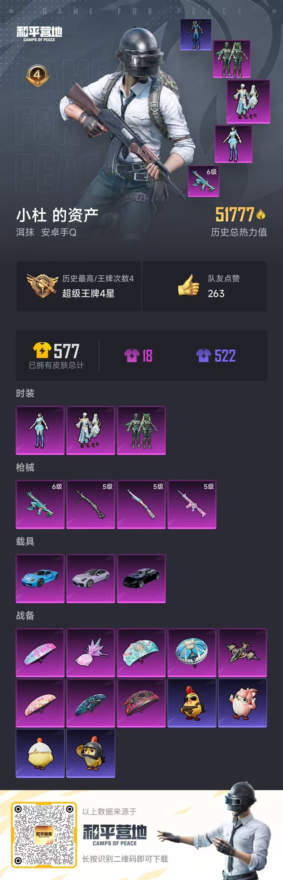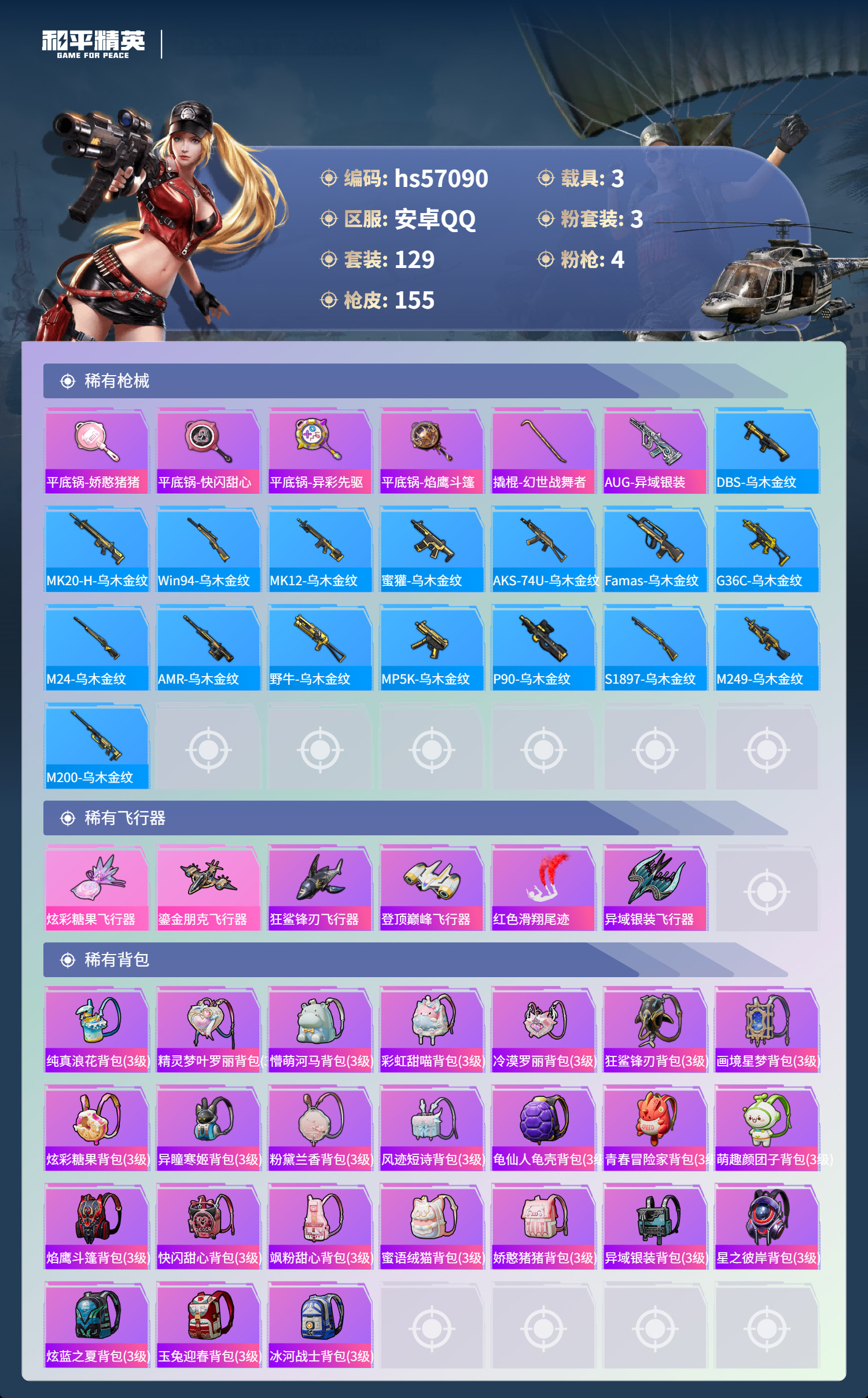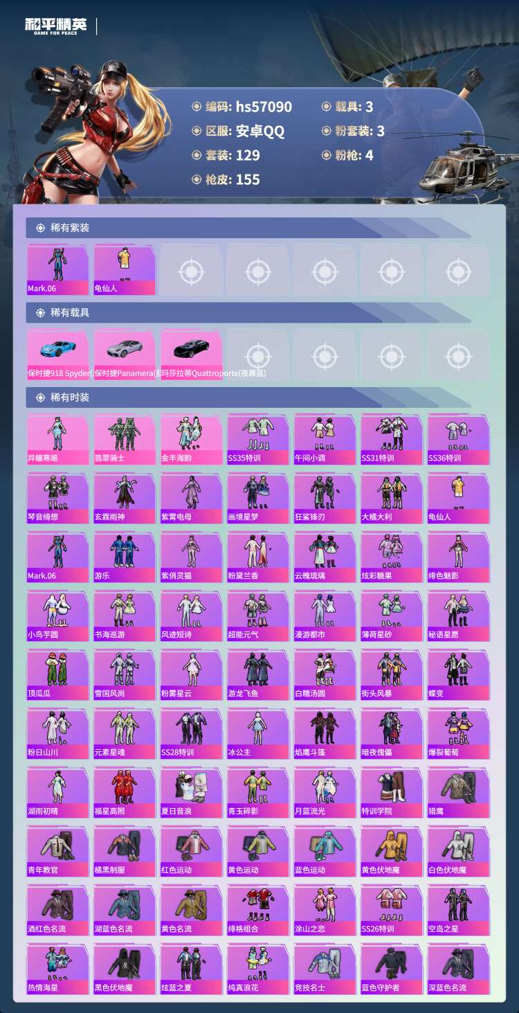 hs57090 安卓手Q-4王牌印记-3粉装-4特效枪-3载具-51777热力值-129套装-155