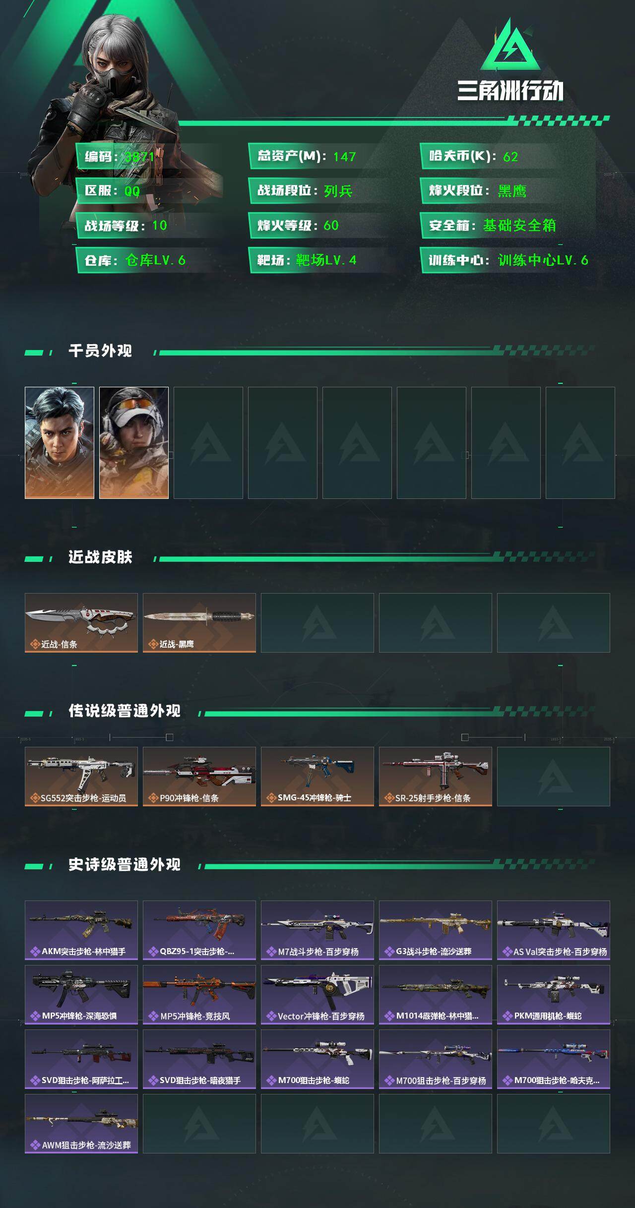 147m总资产-62k哈伏币-60烽火等级-黑鹰-10战场等级-列兵【干员外