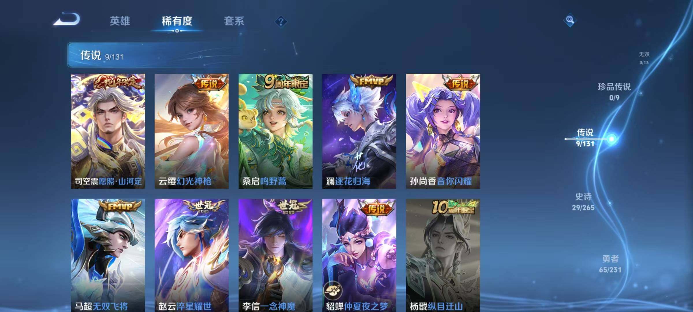 【传说皮肤】:司空震愿照山河定,云缨幻光神枪,桑启鸣野蒿,澜逐花归海,孙尚香音你闪耀,马超无双飞将,赵云淬星耀世,李信一念神魔,貂蝉仲夏夜之梦