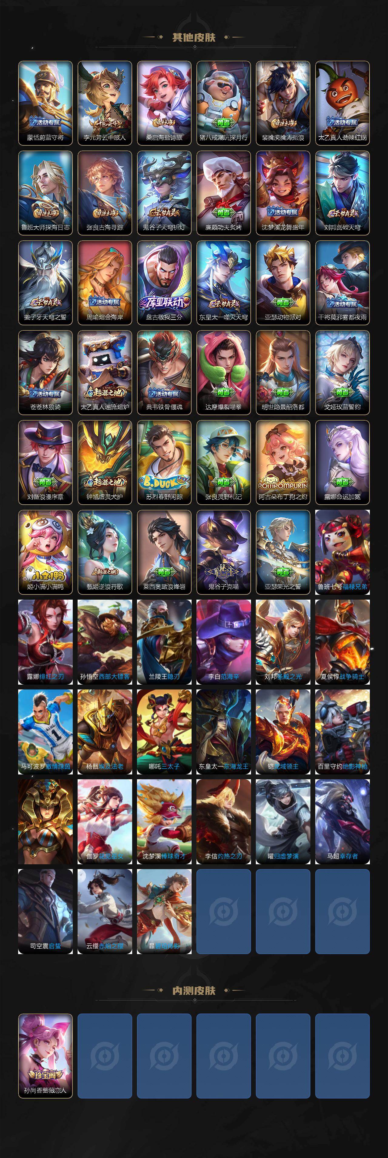 【限定皮肤】:姜子牙天穹之誓,狄仁杰阴阳师,赵云皇家上将,孙尚香蔷薇恋人,元歌无心,达摩沙漠行僧,项羽海滩派对,李元芳云中旅人,鬼谷子五谷丰年,沈梦溪大