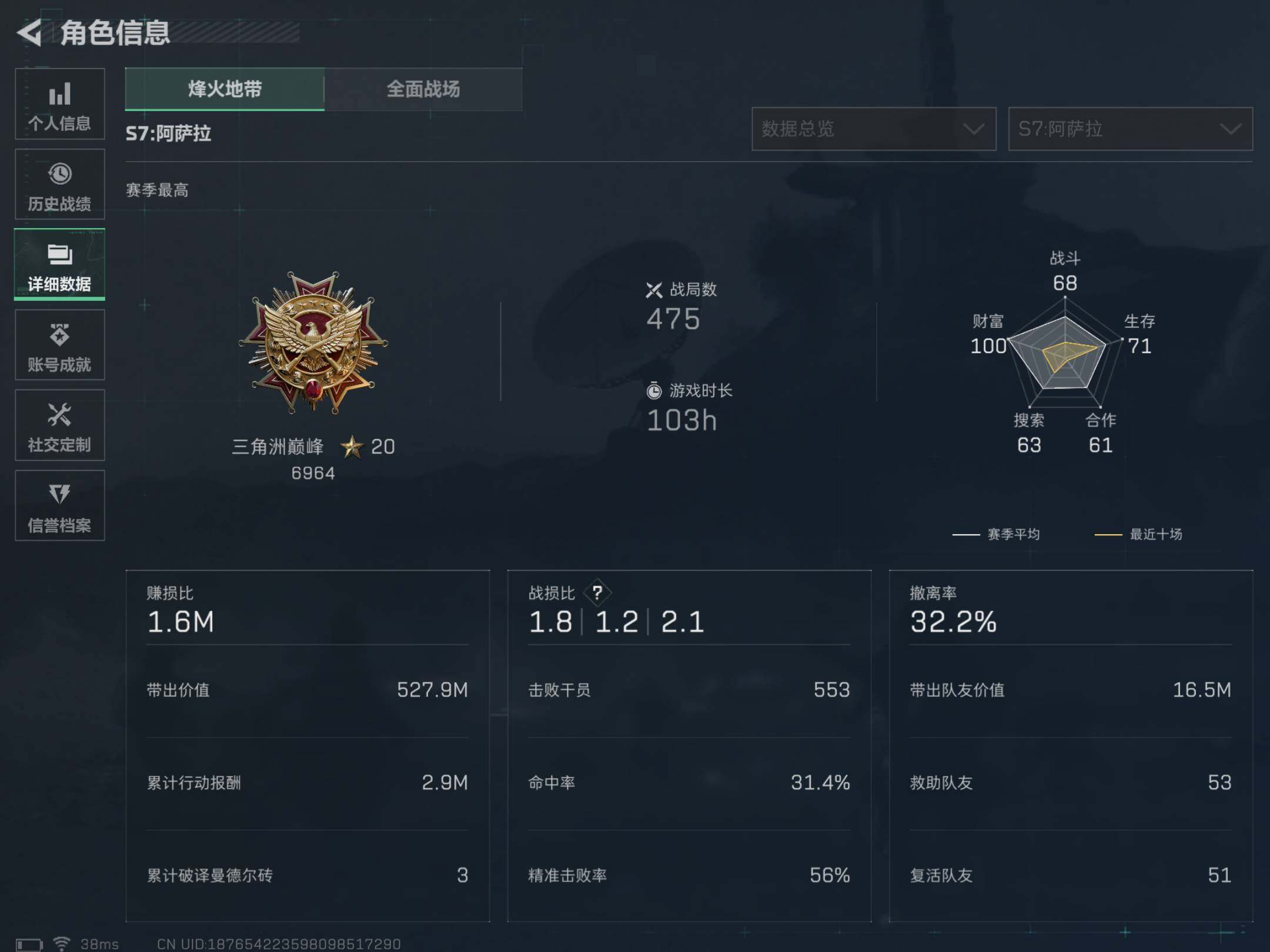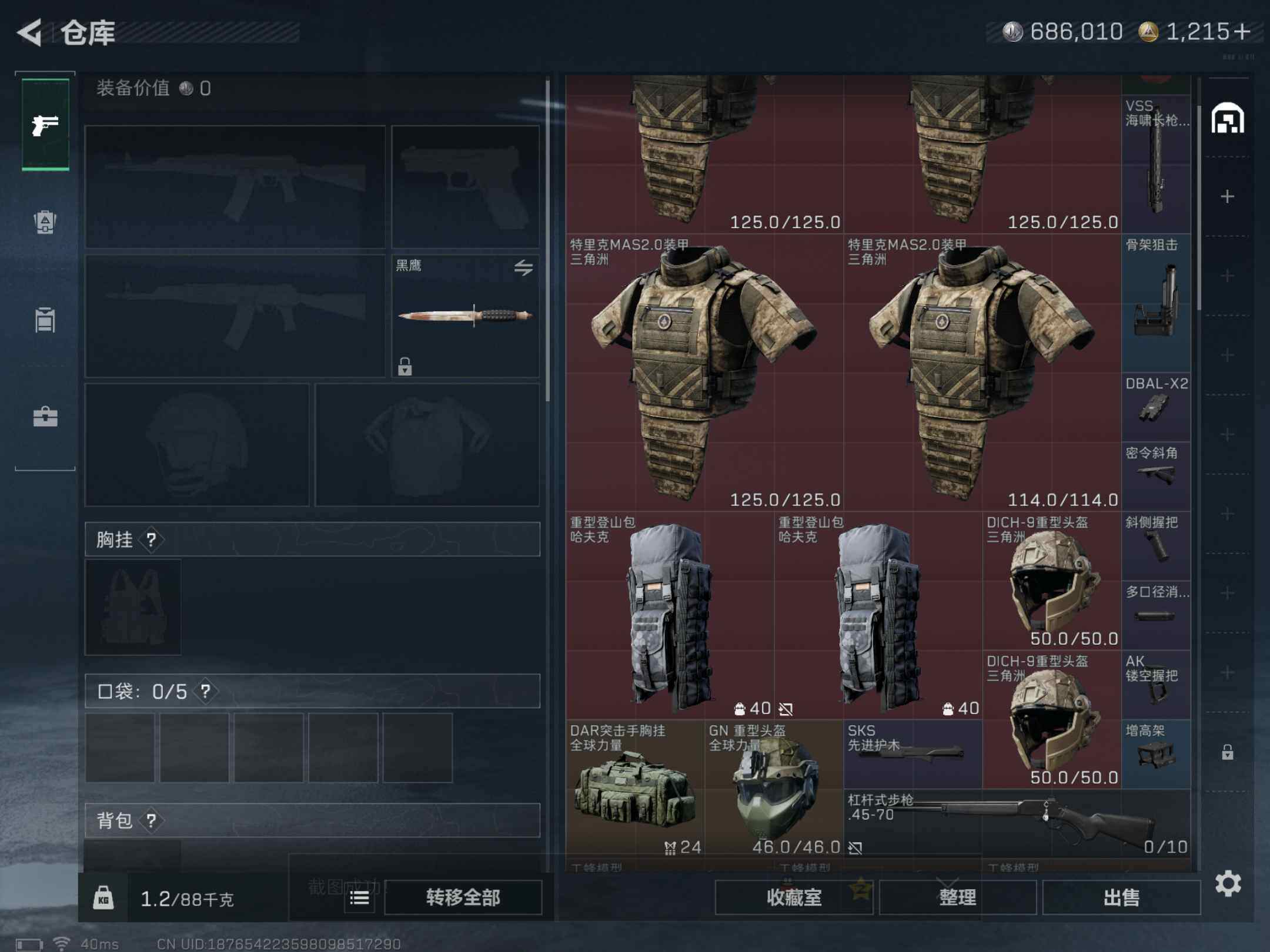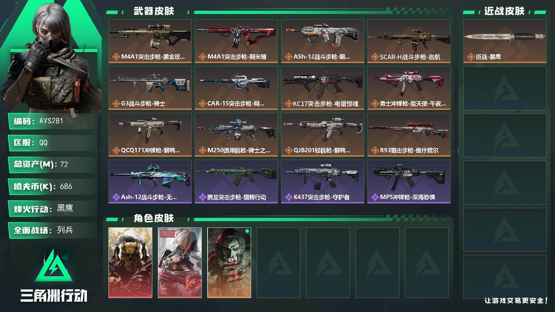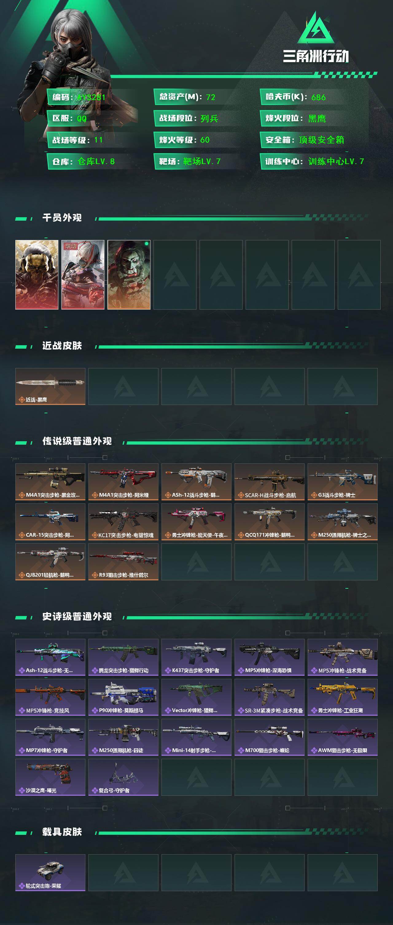 72m总资产-686k哈伏币-60烽火等级-黑鹰-11战场等级-列兵