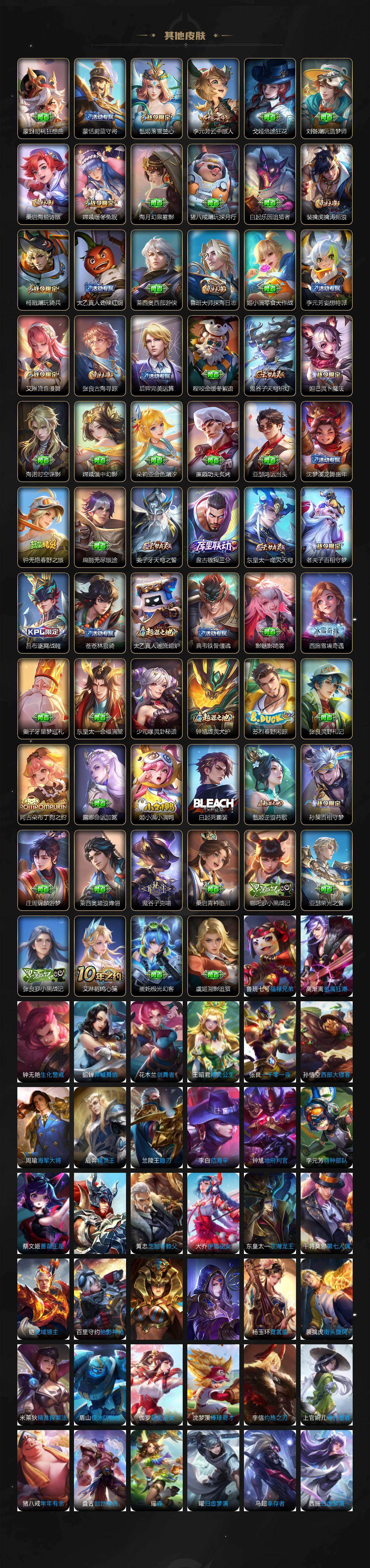 【传说皮肤】:后羿神树通天,妲己愿照众生和,云缨幻光神枪,嬴政玄雷天君,桑启鸣野蒿,孙尚香乘龙问璇玑,王昭君星穹之声,橘右京枫霜尽,孙尚香音你闪耀,大乔挚爱花嫁,孙策挚爱之约,孙尚香异界灵契,后羿黄金射手座,孙尚香末日机甲,武则天